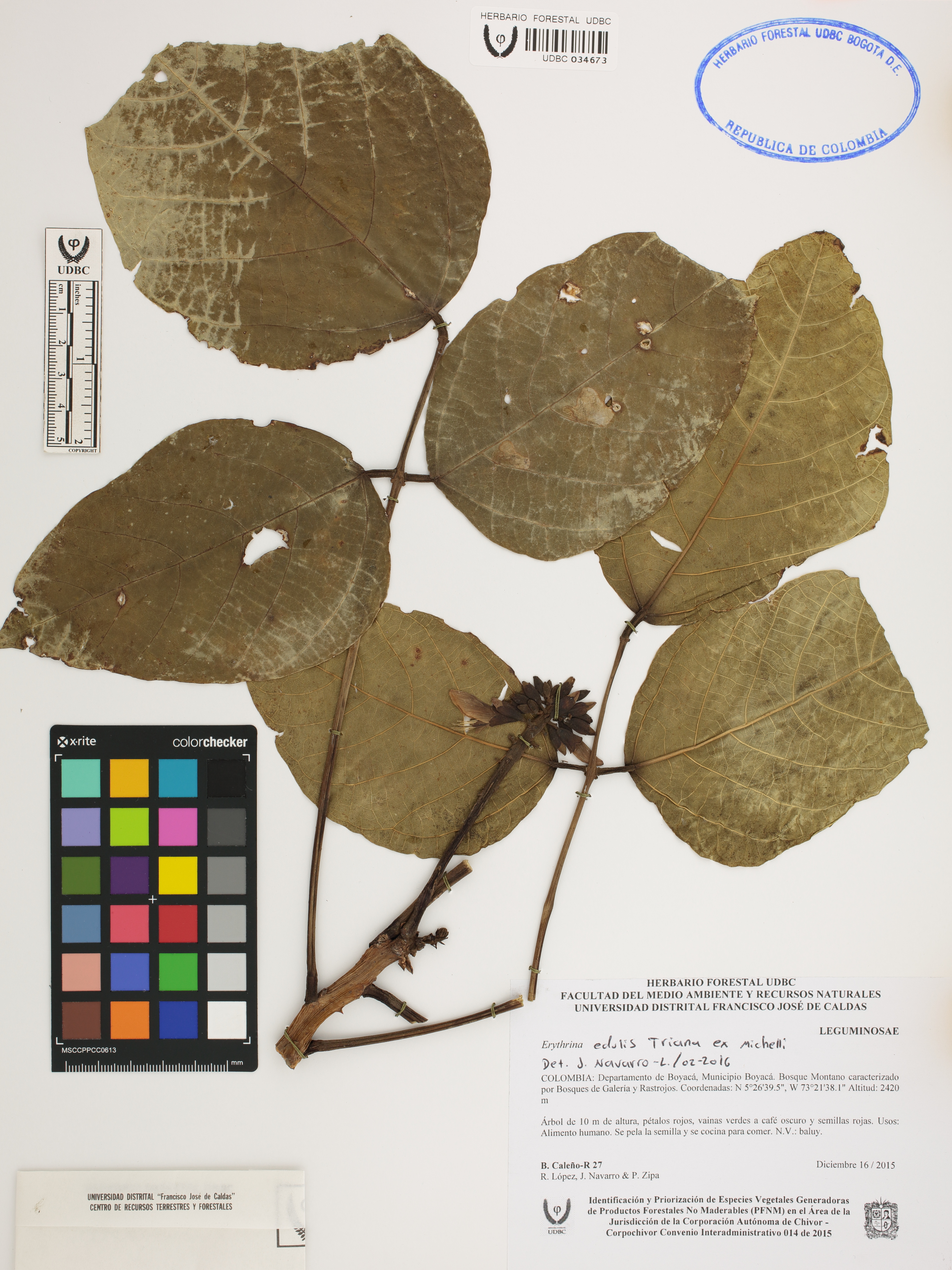 Fotografía del ejemplar Caleño-R., B. 27, determinado como Erythrina edulis en el año 2016