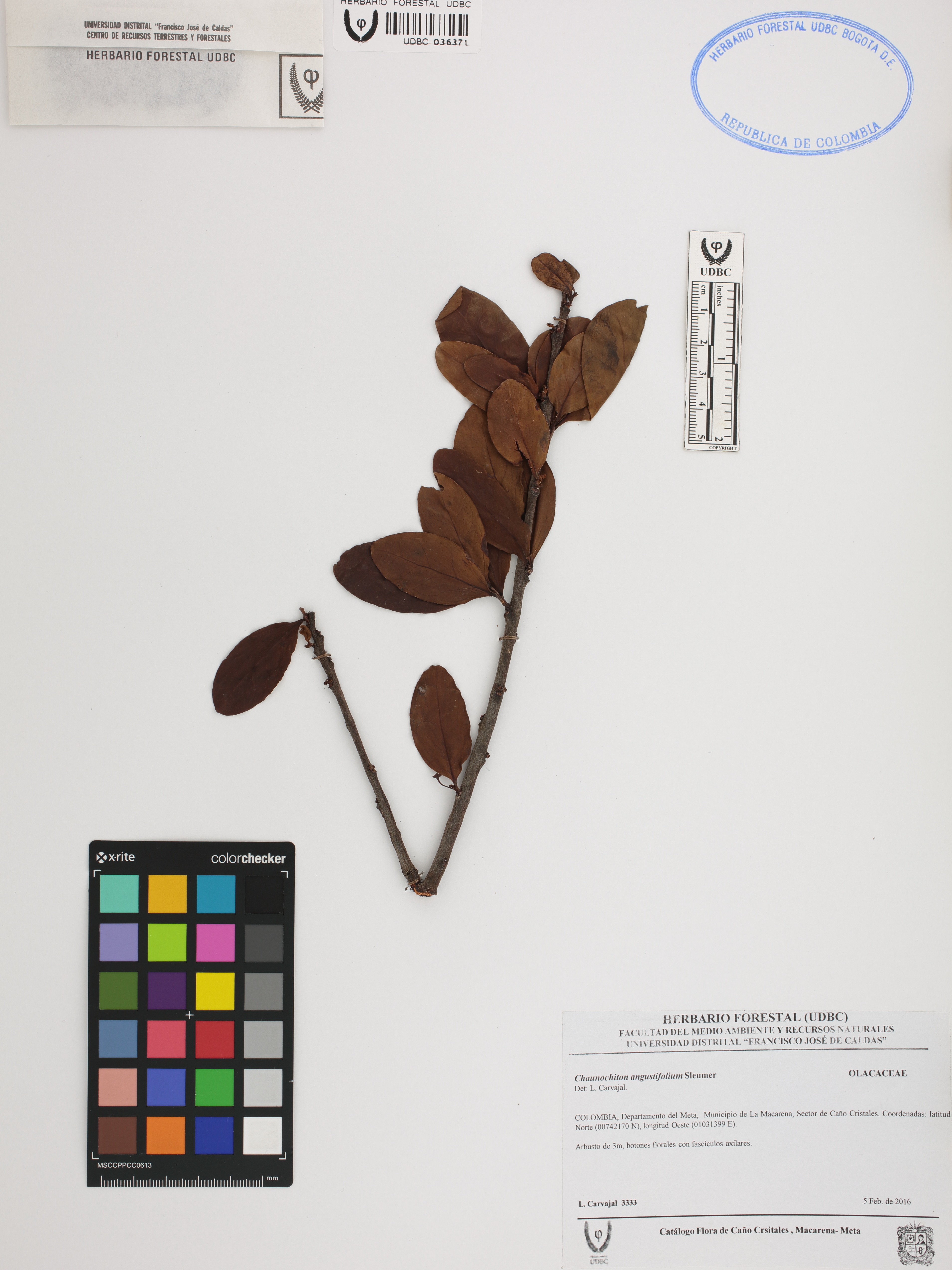 Fotografía del ejemplar Carvajal, L. 3333, determinado como Chaunochiton angustifolium
