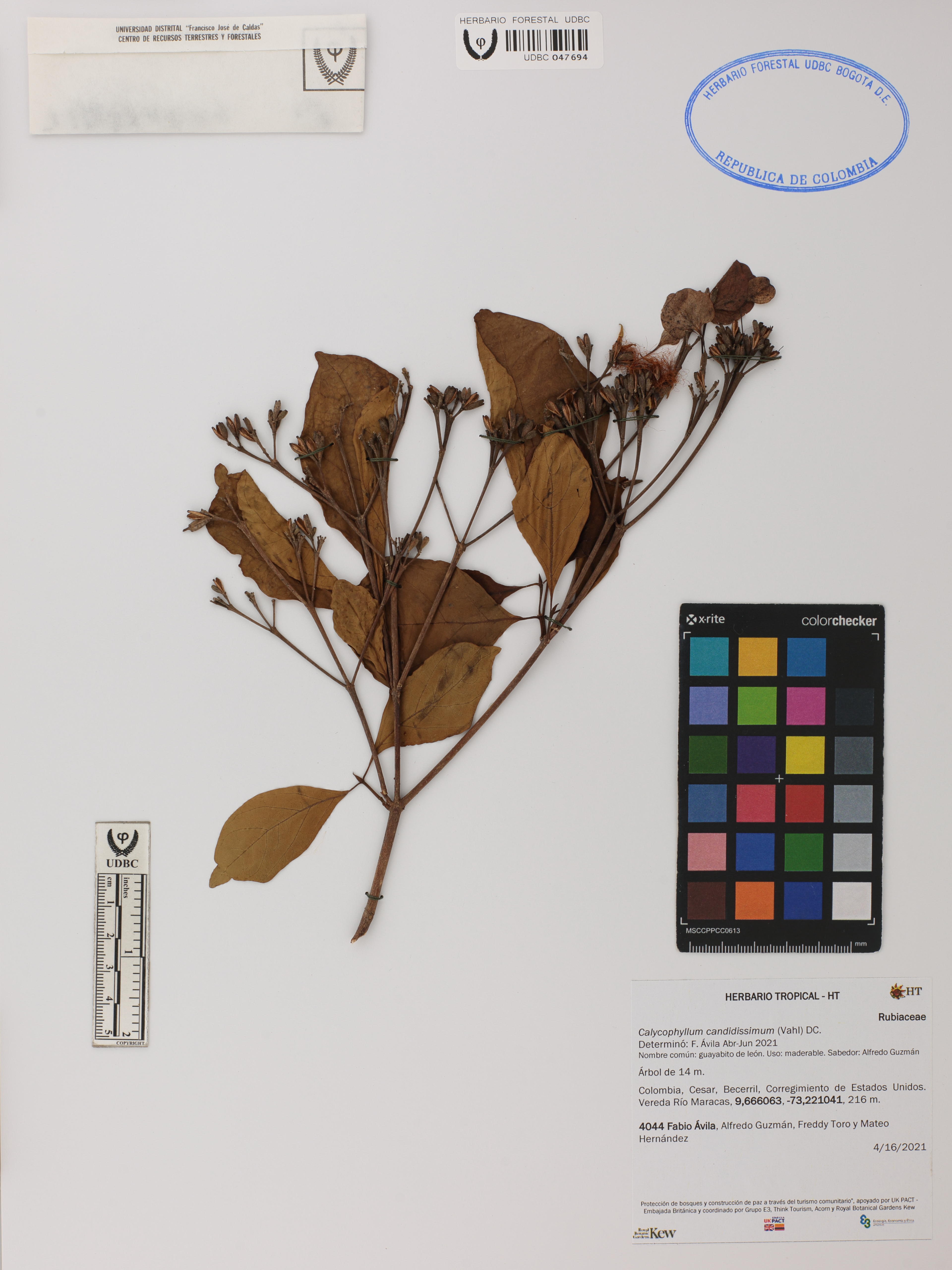 Fotografía del ejemplar Ávila, F. 4044, determinado como Calycophyllum candidissimum en el año 2021
