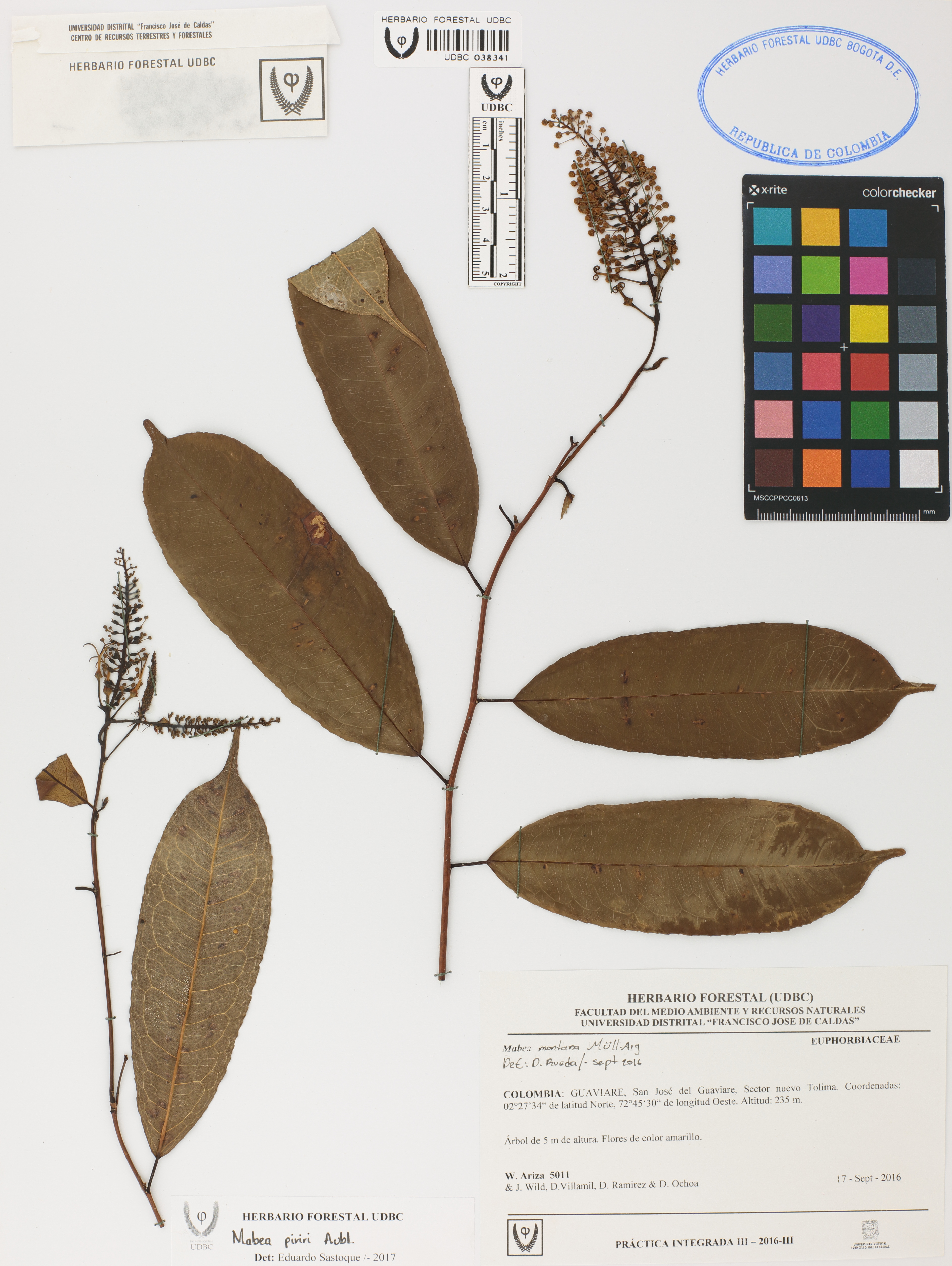 Fotografía del ejemplar Ariza, W. 5011, determinado como Mabea piriri en el año 2017
