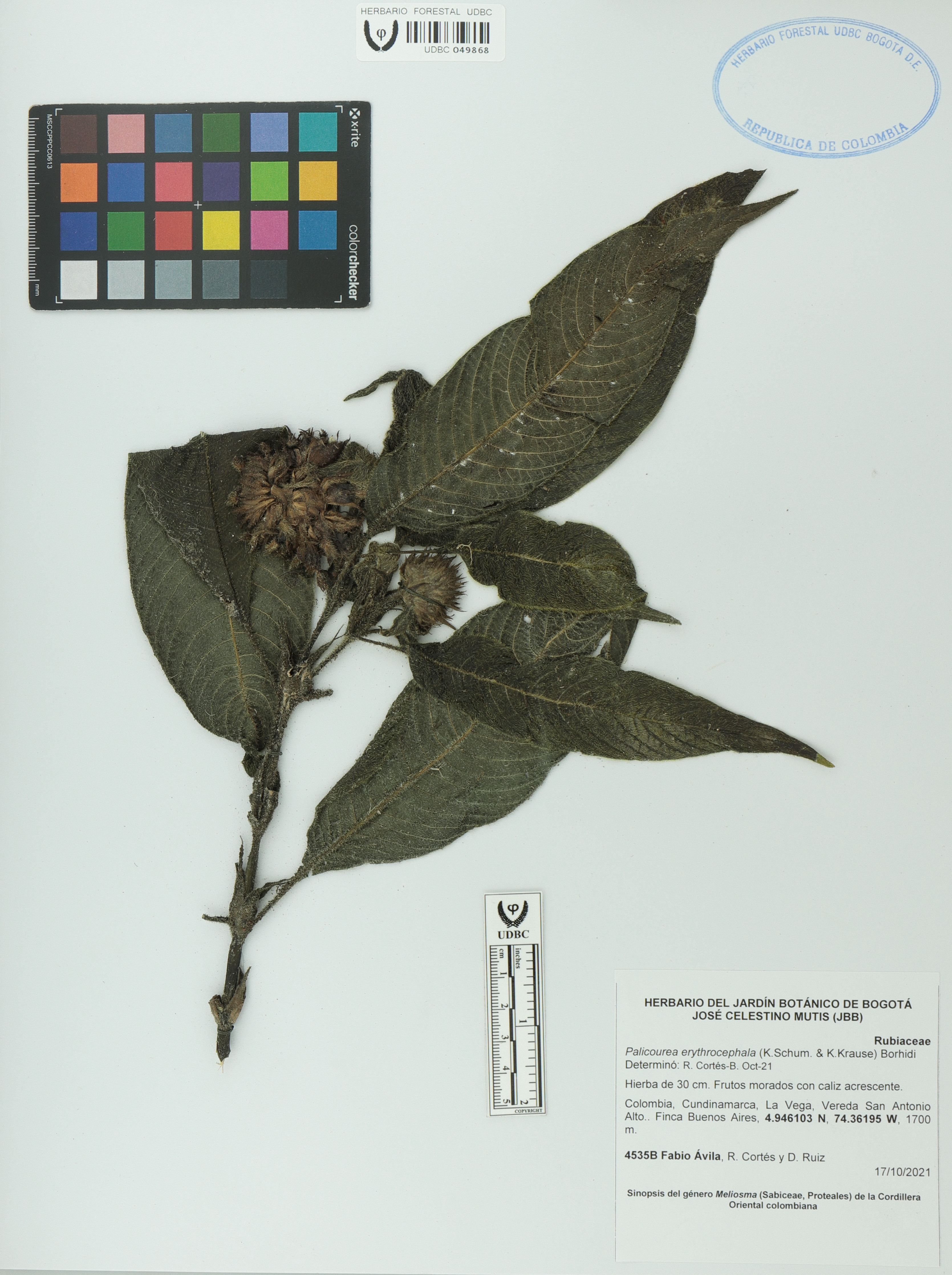Fotografía del ejemplar Ávila, F. 4535B, determinado como Palicourea erythrocephala en el año 2021
