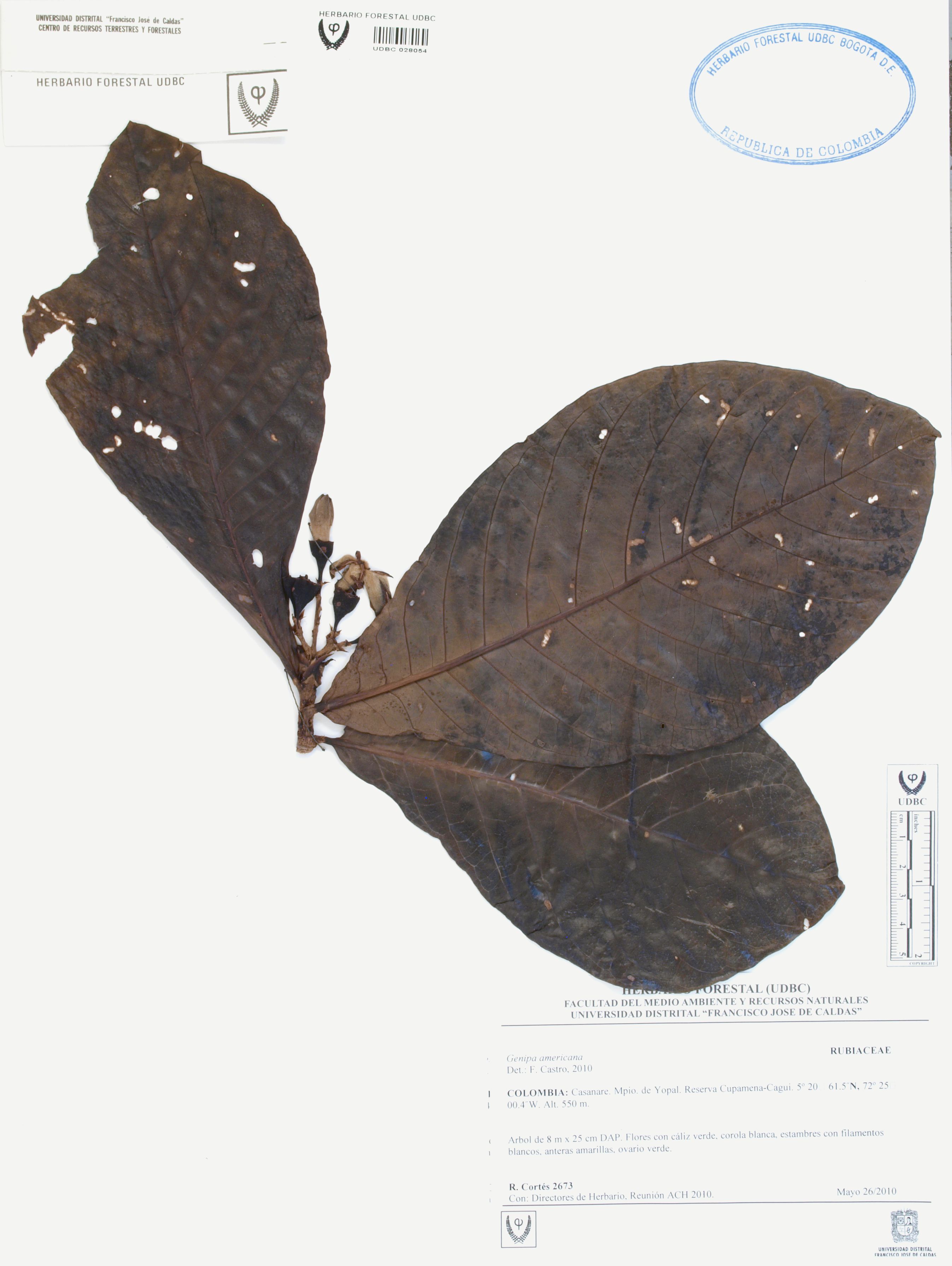 Fotografía del ejemplar Cortés-B., R. 2673, determinado como Genipa americana en el año 2010