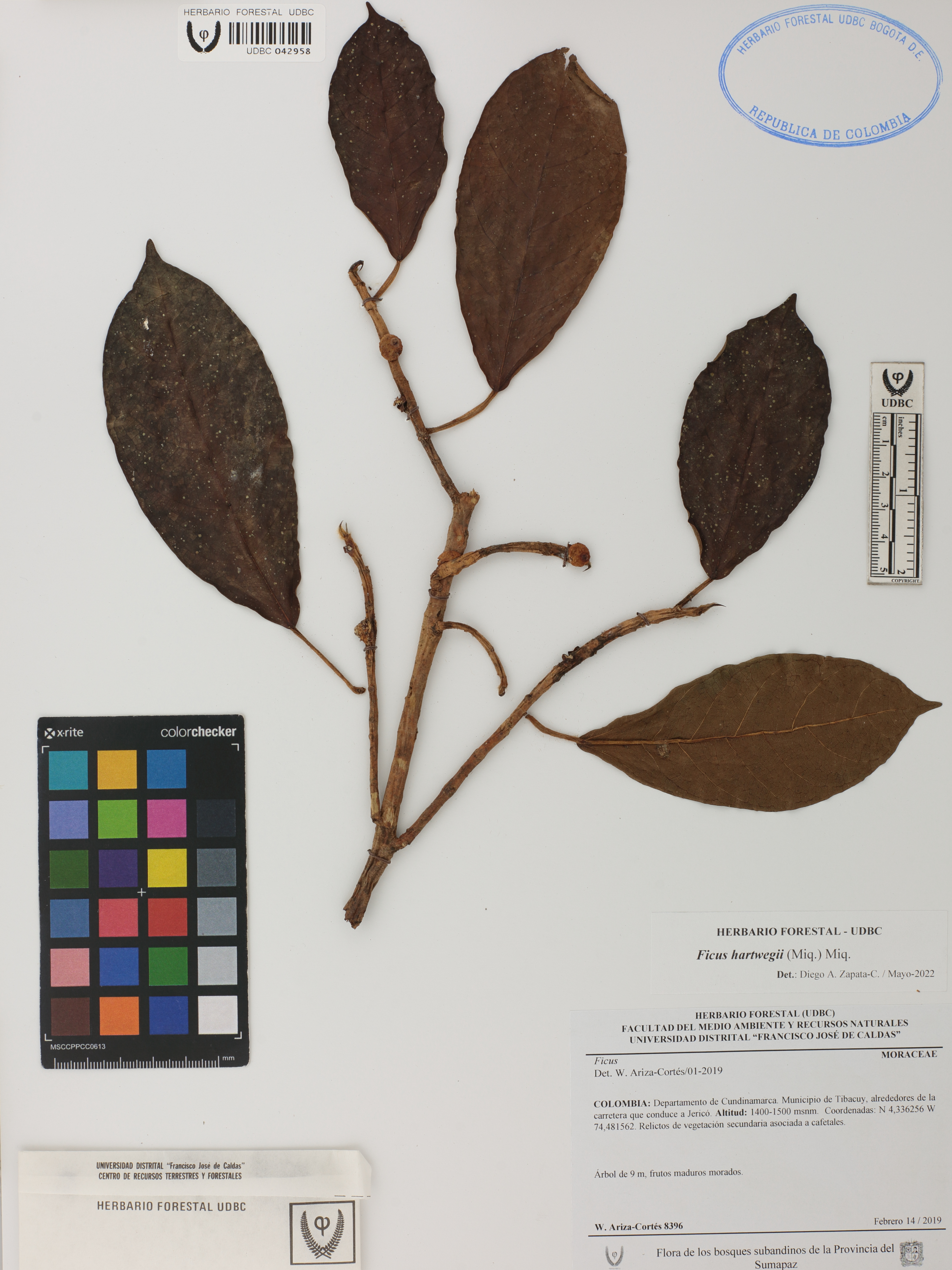 Fotografía del ejemplar Ariza-Cortés, W. 8396, determinado como Ficus hartwegii en el año 2022