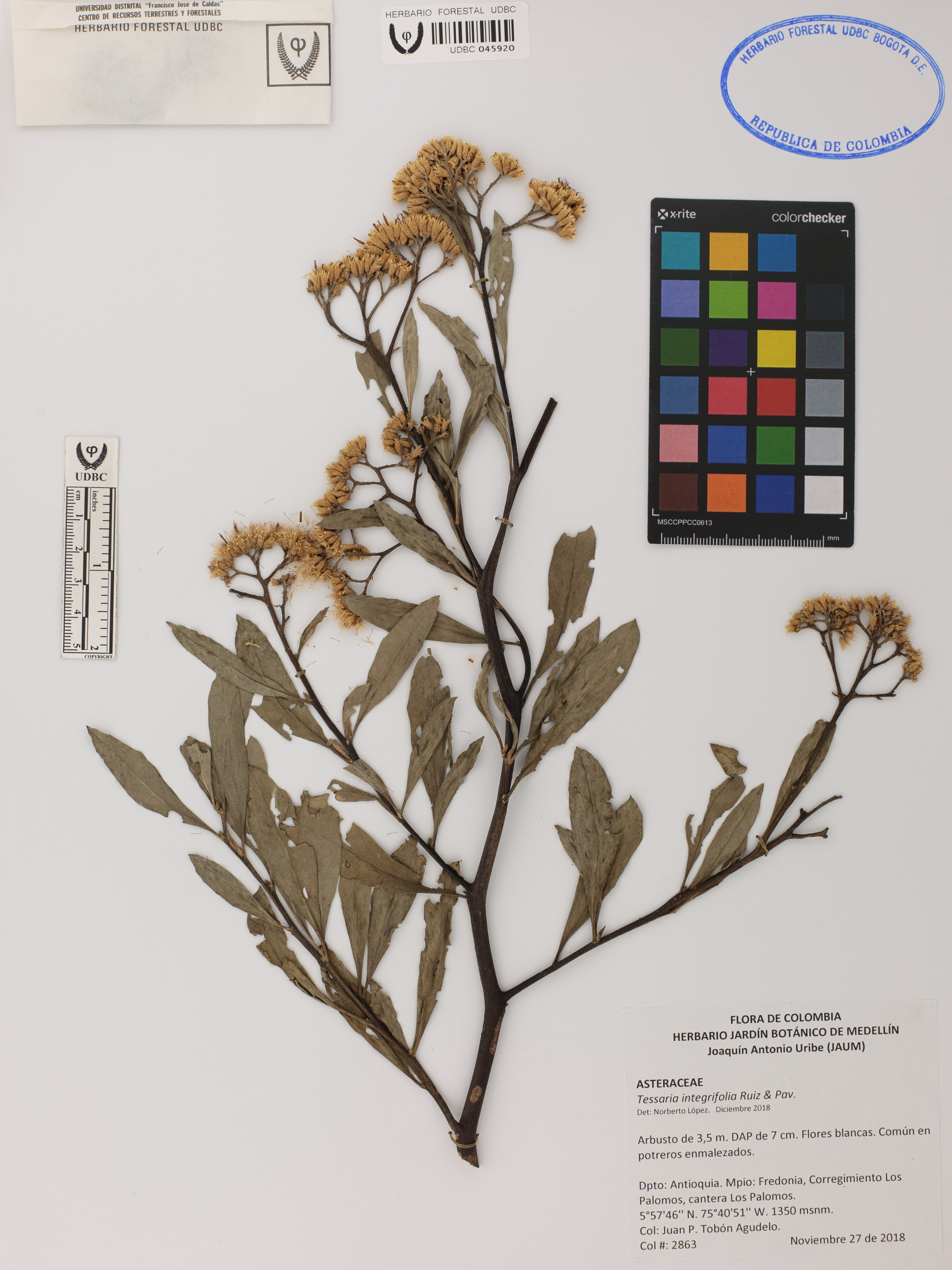 Fotografía del ejemplar Tobón-Agudelo, J. 2863, determinado como Tessaria integrifolia en el año 2018