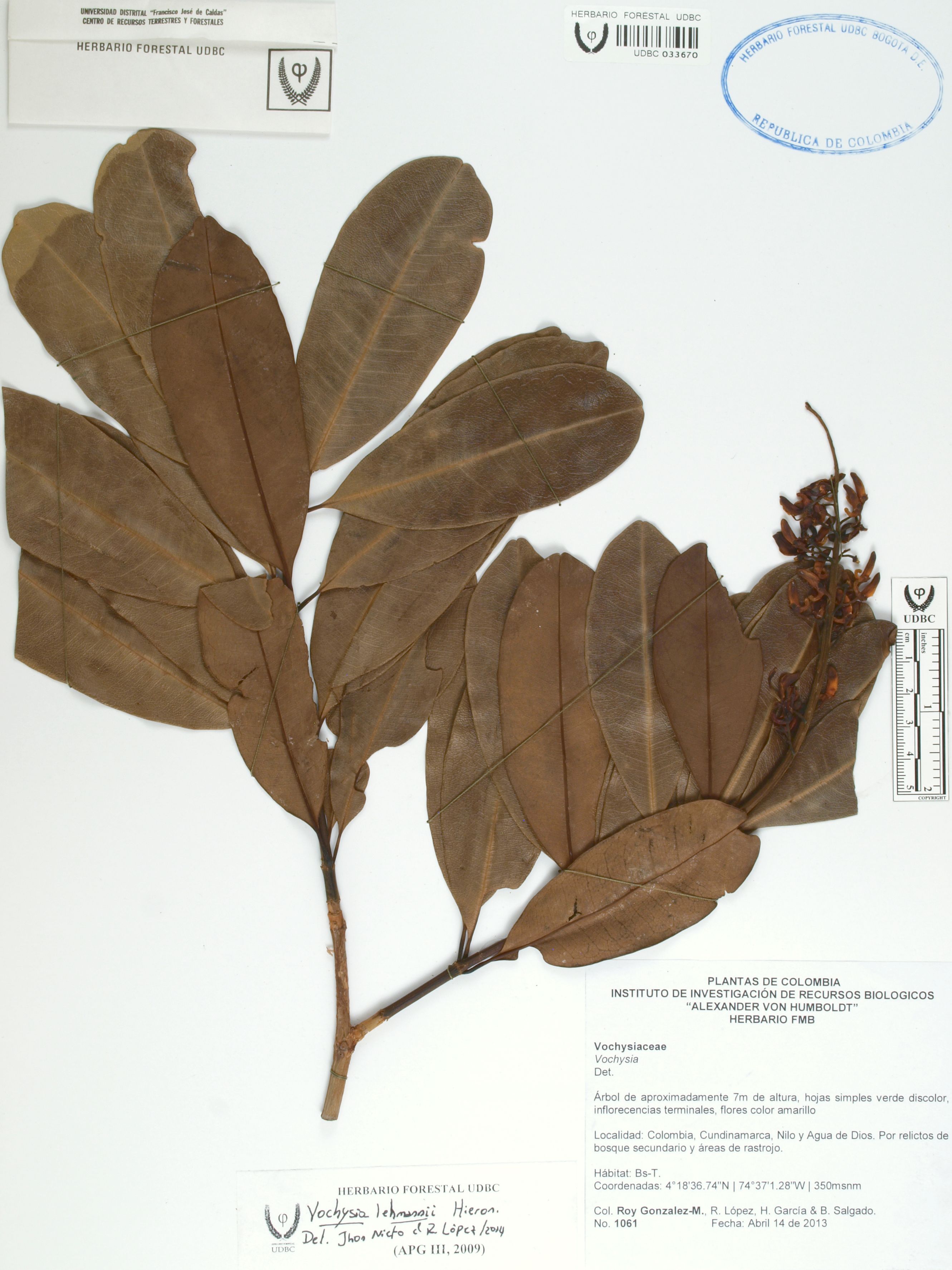 Fotografía del ejemplar González-M., R. 1061, determinado como Vochysia lehmannii en el año 2014