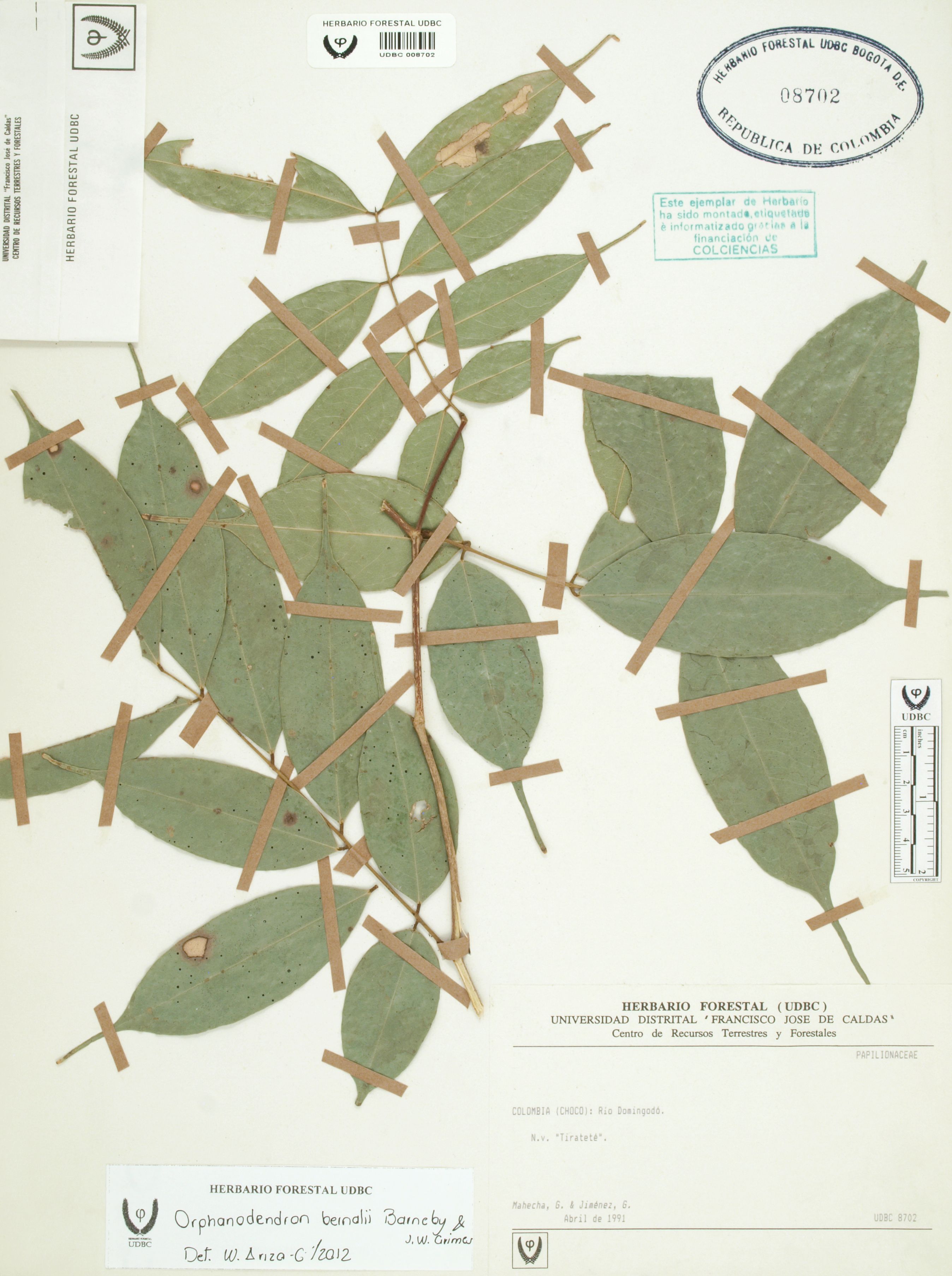 Fotografía del ejemplar Mahecha, G., determinado como Orphanodendron bernalii en el año 2012
