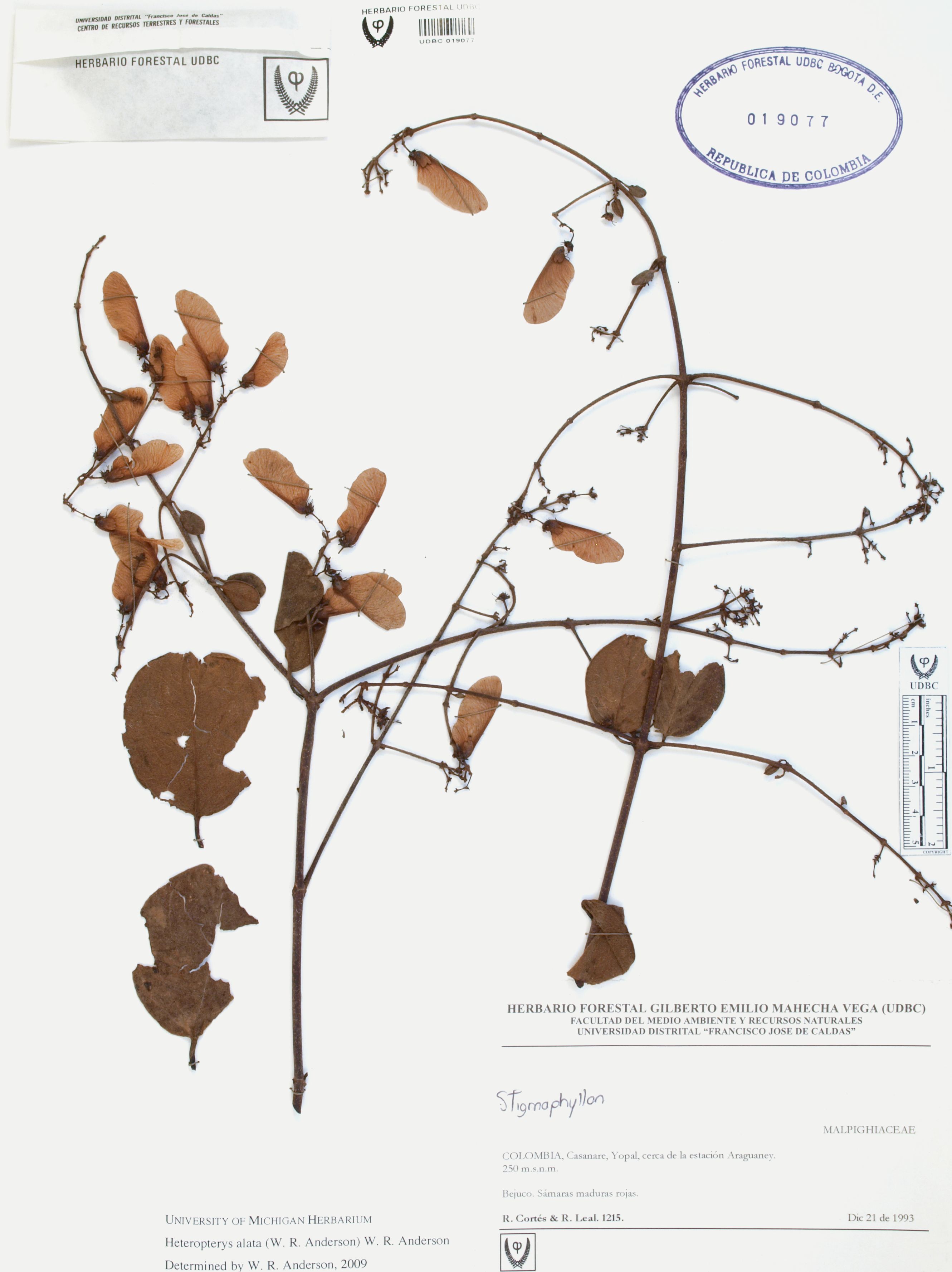 Fotografía del ejemplar Cortés-B., R. 1215, determinado como Heteropterys alata en el año 2009