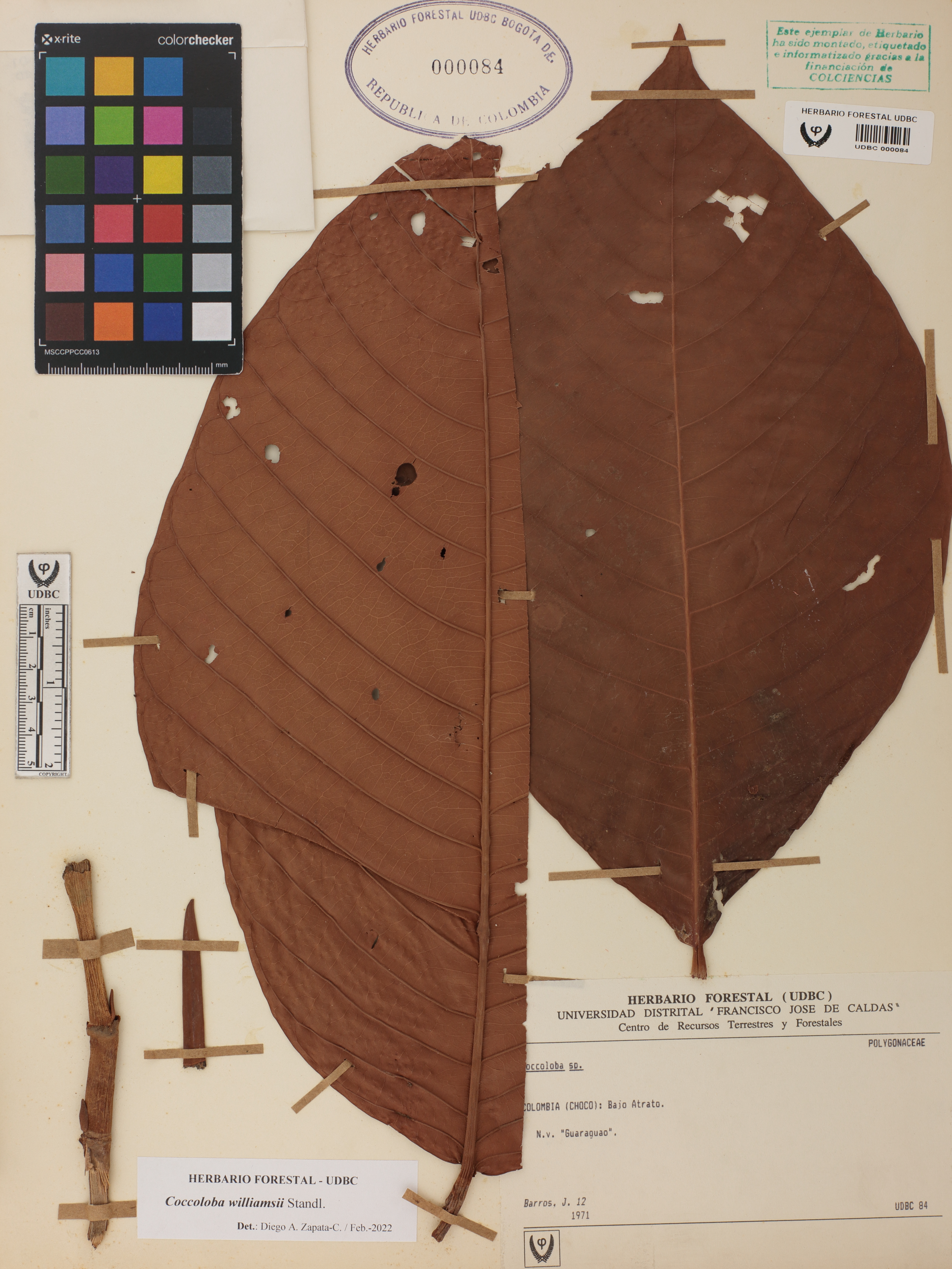 Fotografía del ejemplar Barros, J. 12, determinado como Coccoloba williamsii en el año 2022