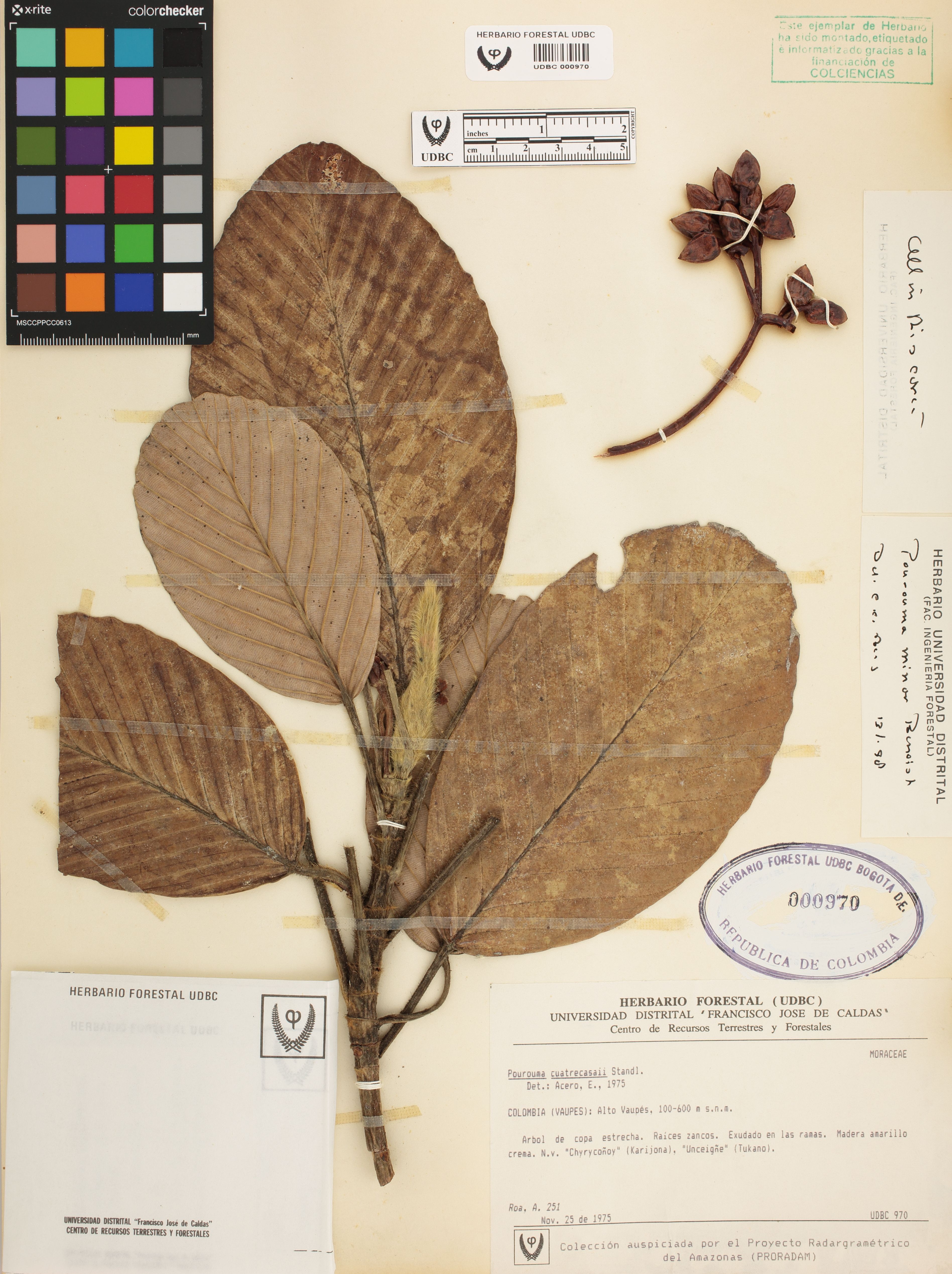 Fotografía del ejemplar Roa, A. 251, determinado como Pourouma minor en el año 1995