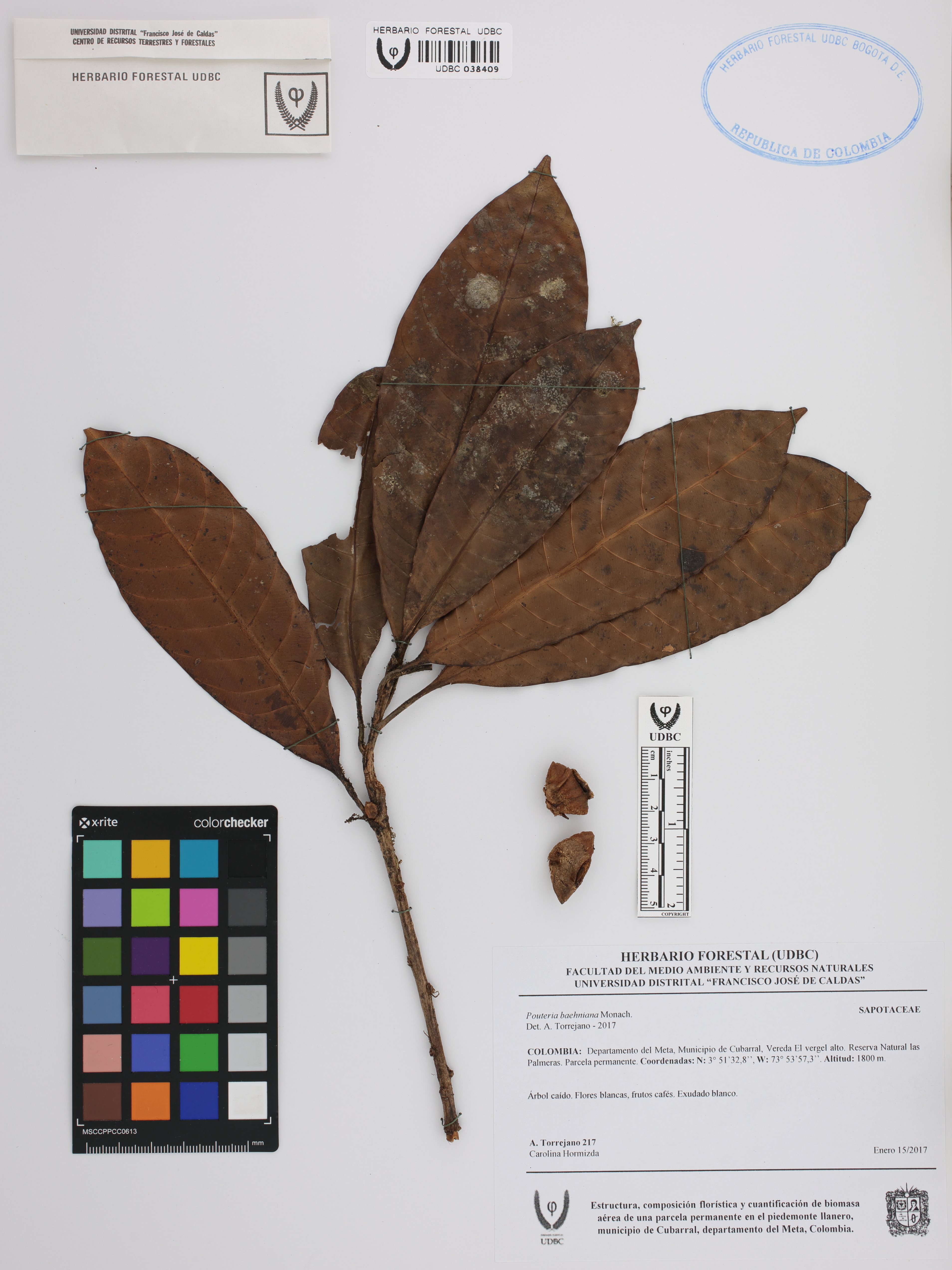 Fotografía del ejemplar Torrejano, A. 217, determinado como Pouteria baehniana en el año 2017