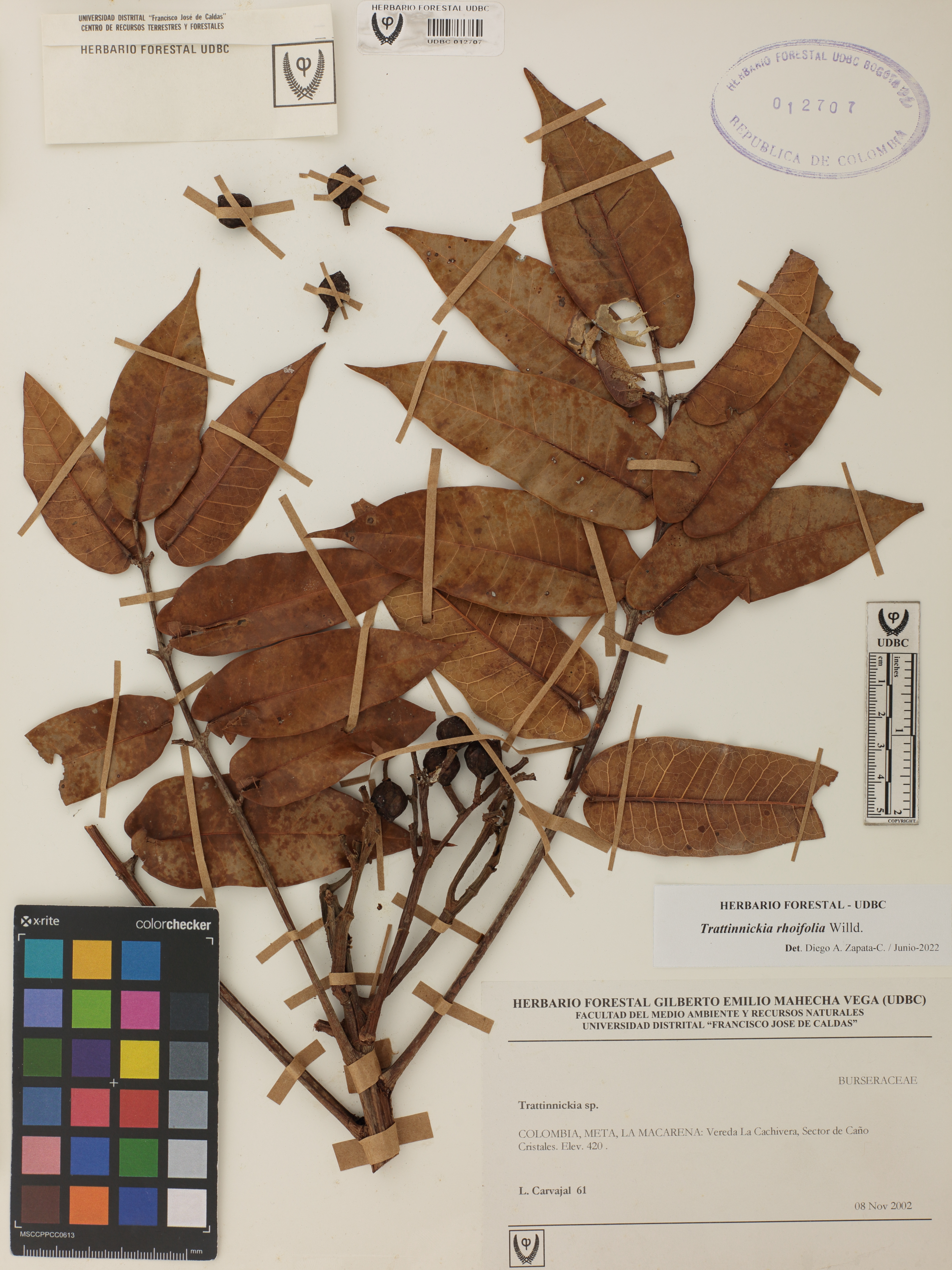Fotografía del ejemplar Carvajal, L. 61, determinado como Trattinnickia rhoifolia en el año 2022