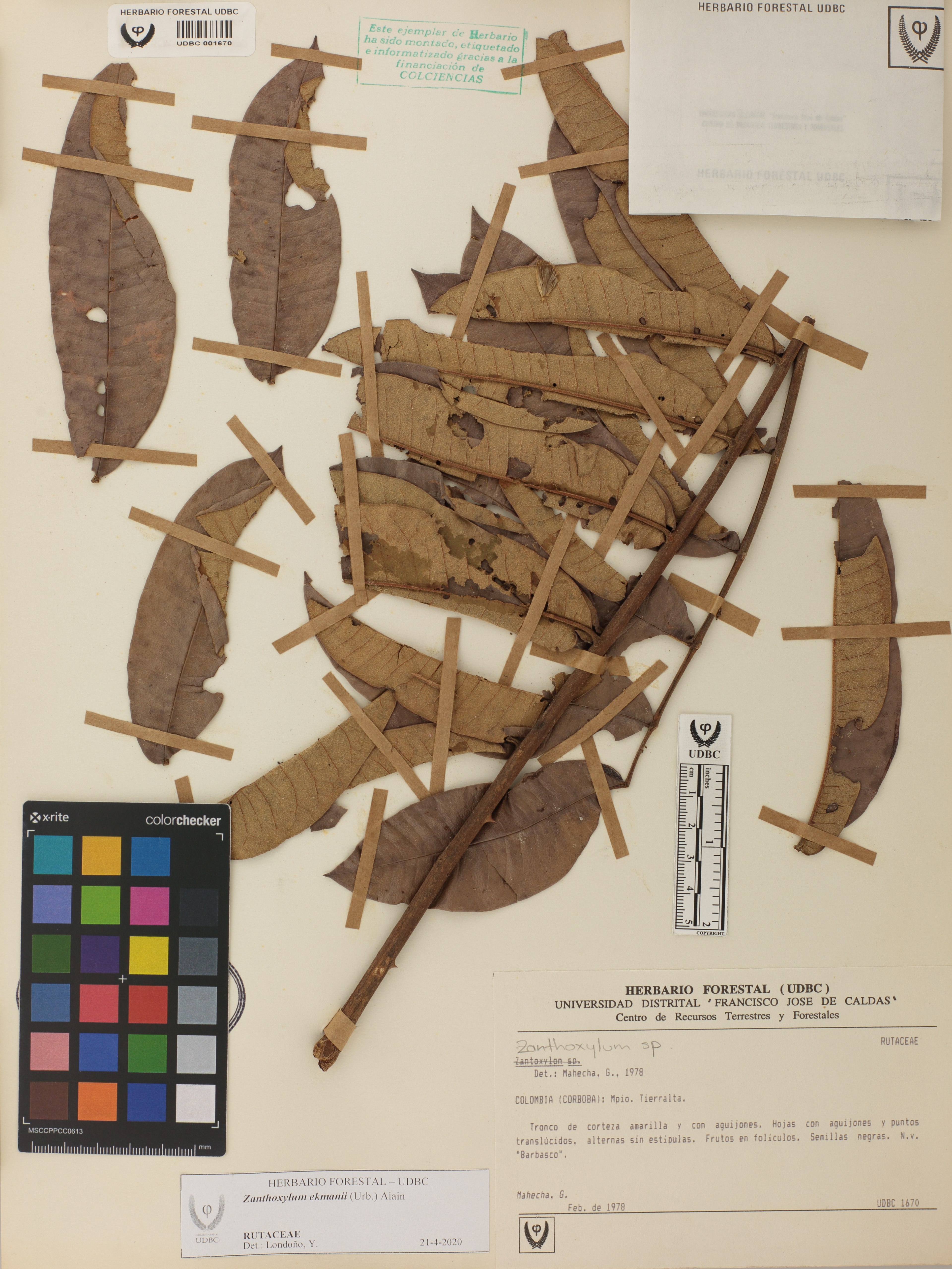 Fotografía del ejemplar Mahecha, G., determinado como Zanthoxylum ekmanii en el año 2020