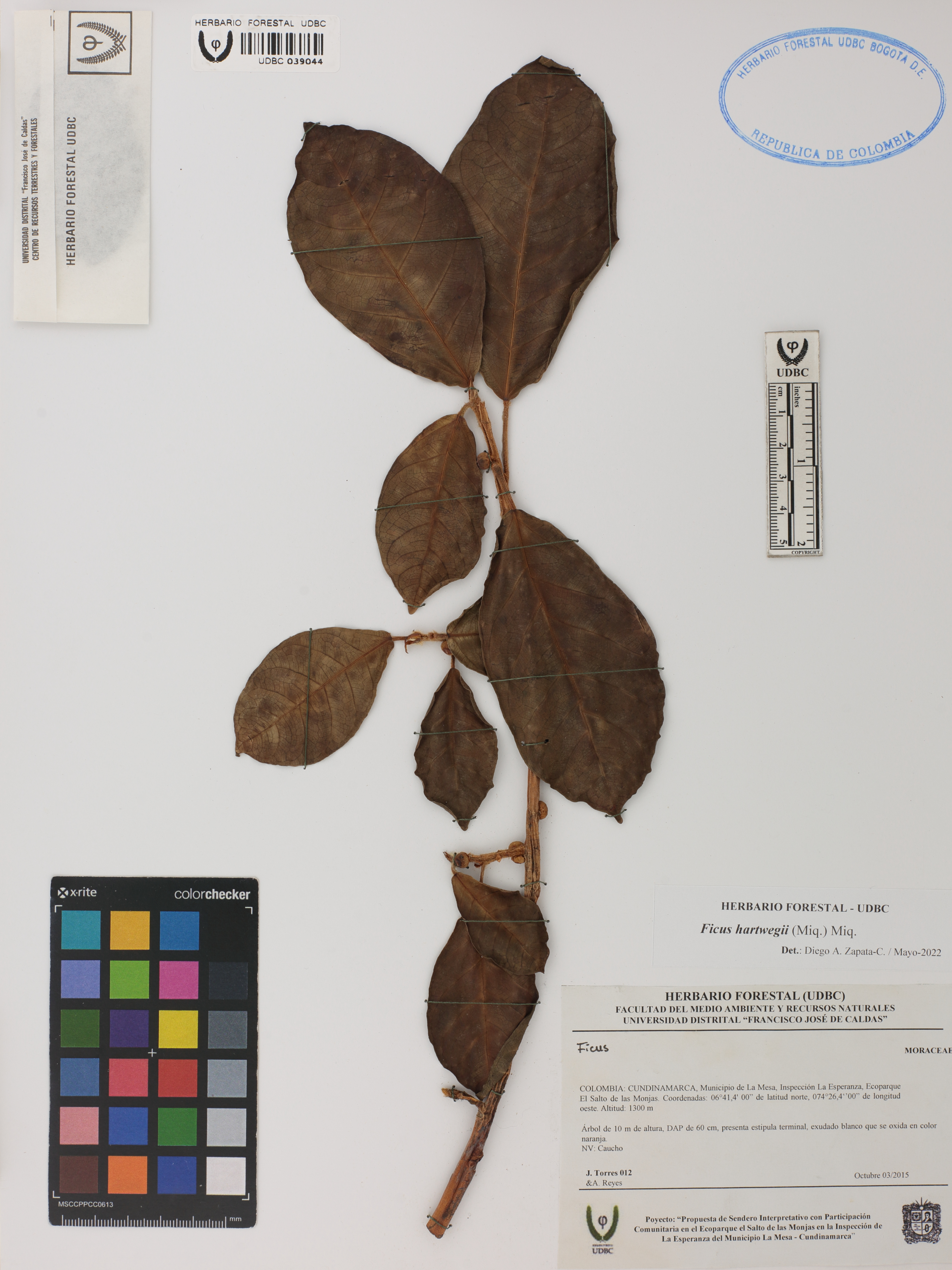 Fotografía del ejemplar Torres, J. 12, determinado como Ficus hartwegii en el año 2022