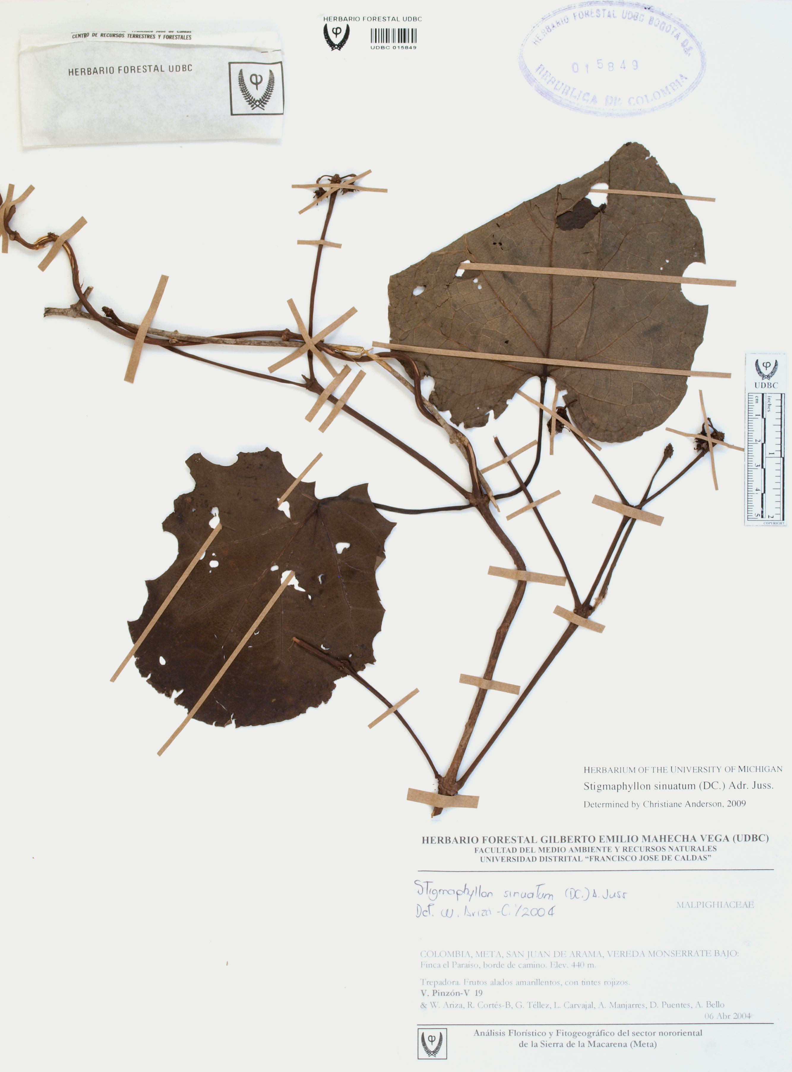 Fotografía del ejemplar Pinzón, V. 19, determinado como Stigmaphyllon sinuatum en el año 2009