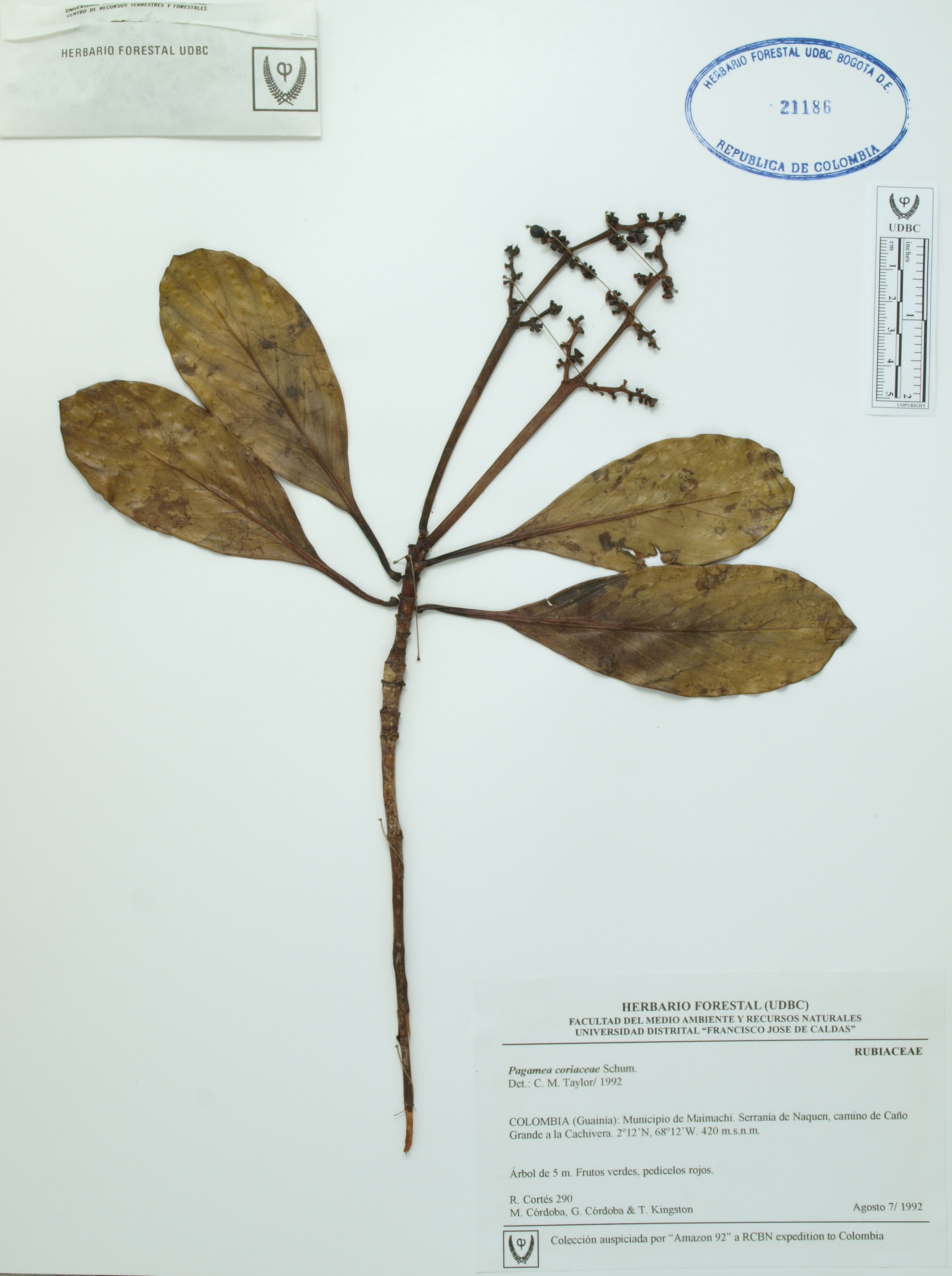 Fotografía del ejemplar Cortés-B., R. 290, determinado como Pagamea coriacea en el año 1992