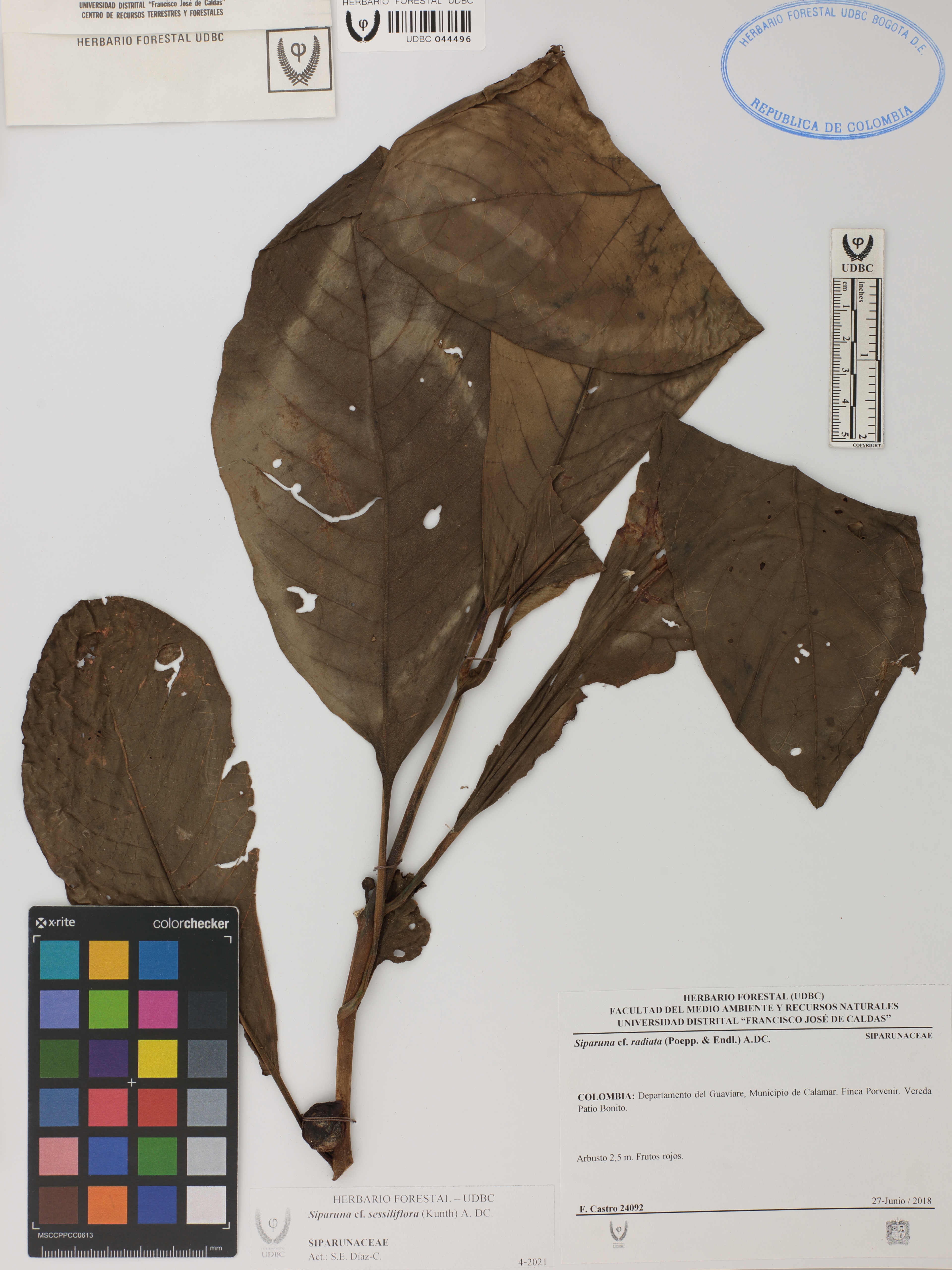 | dc.description | Fotografía del ejemplar Castro, F. 24092, determinado como Siparuna sessiliflora en el año 2018 | |
