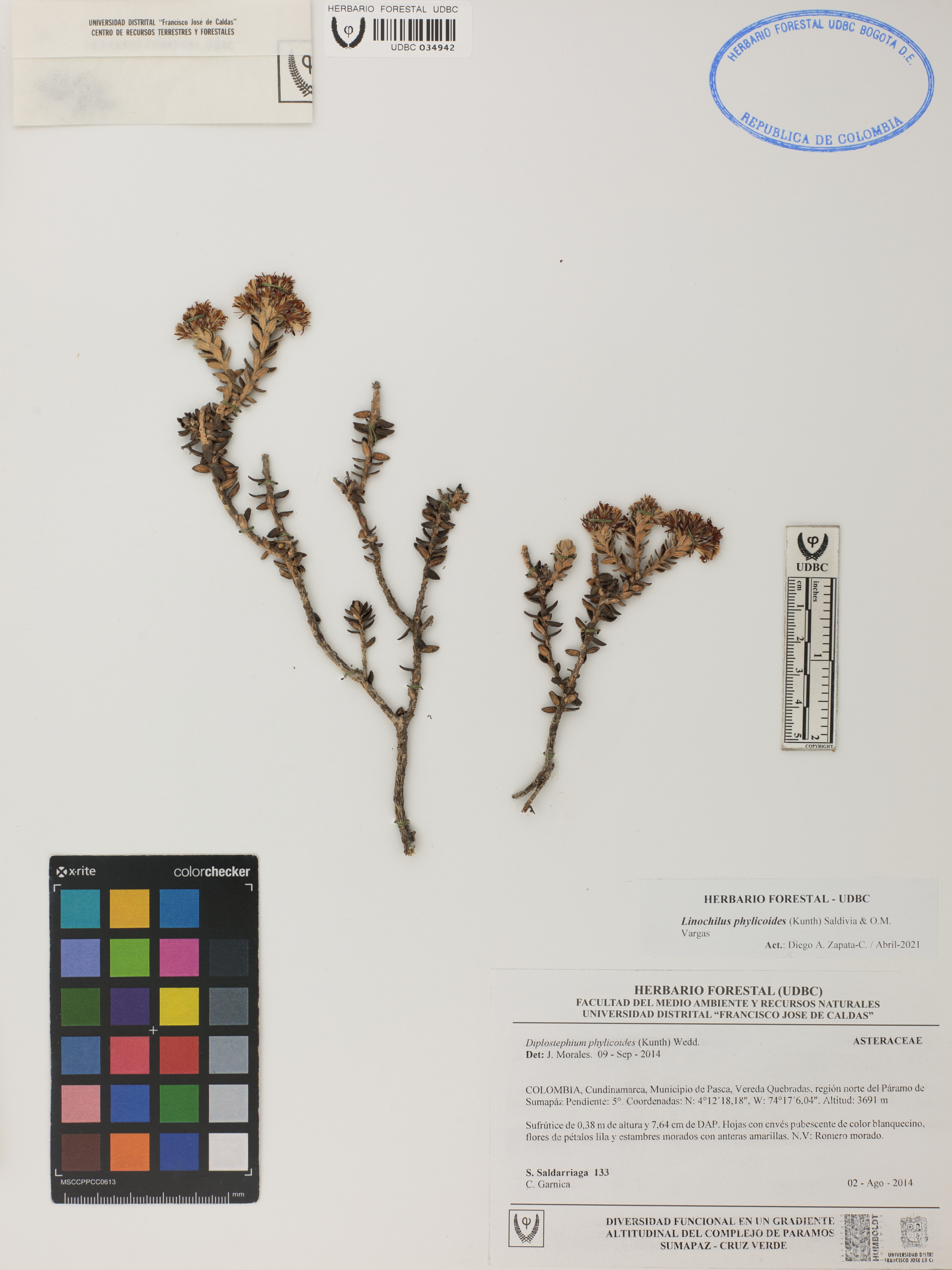 Fotografía del ejemplar Saldarriaga, S. 133, determinado como Linochilus phylicoides en el año 2014