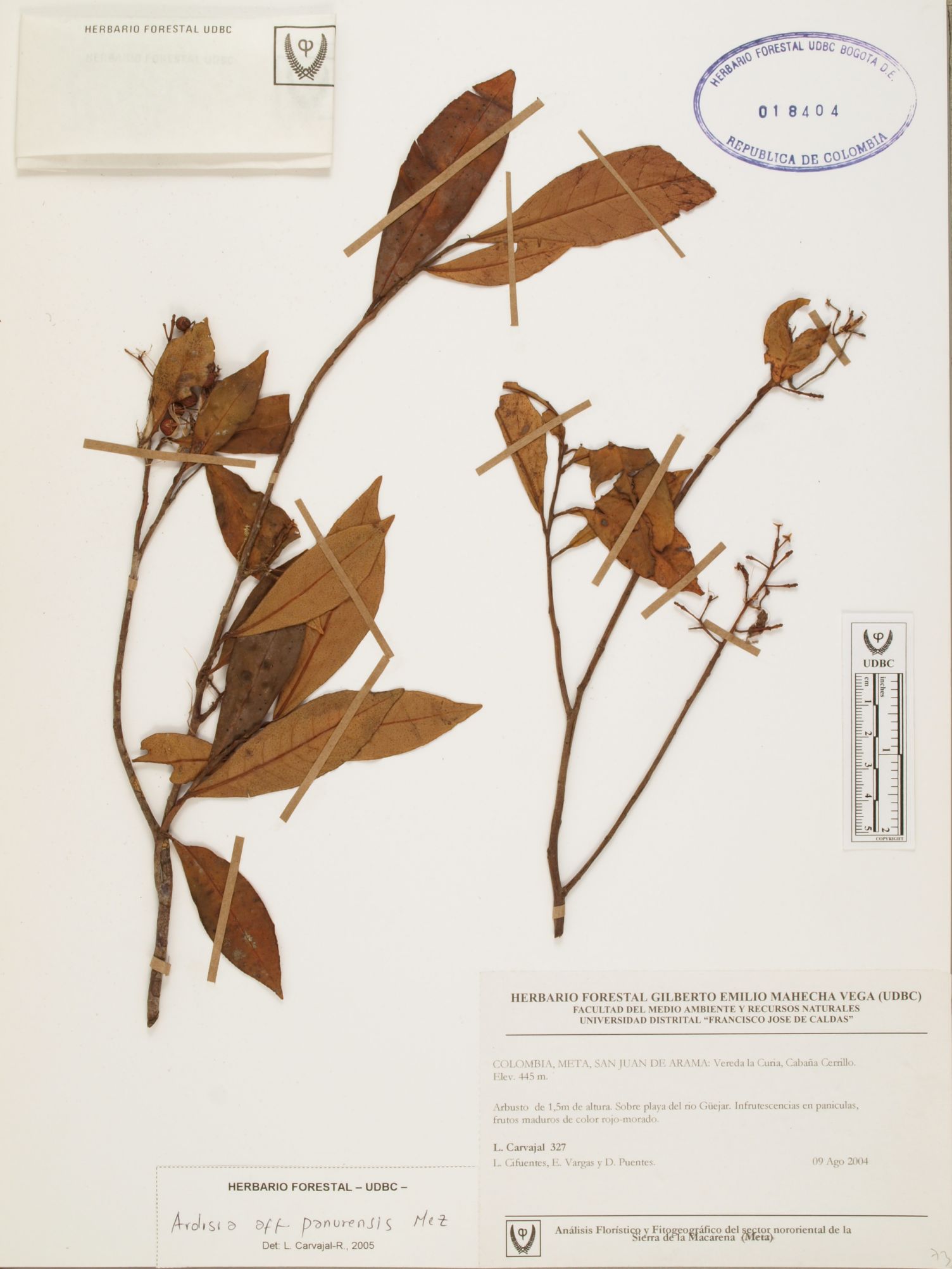 | dc.description | Fotografía del ejemplar Carvajal, L. 327, determinado como Ardisia panurensis en el año 2005 | |