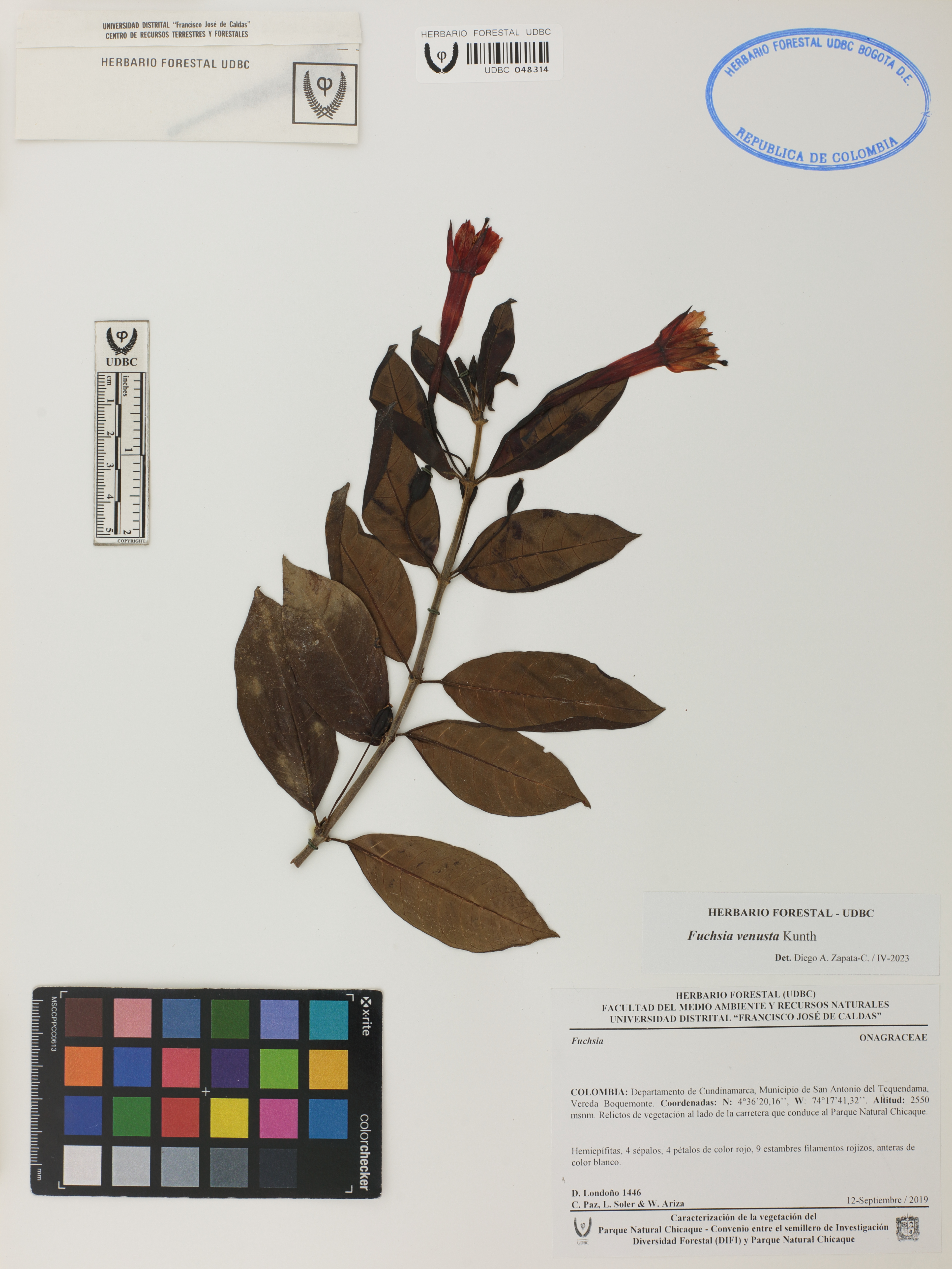 Fotografía del ejemplar Londoño, D. 1446, determinado como Fuchsia venusta en el año 2023