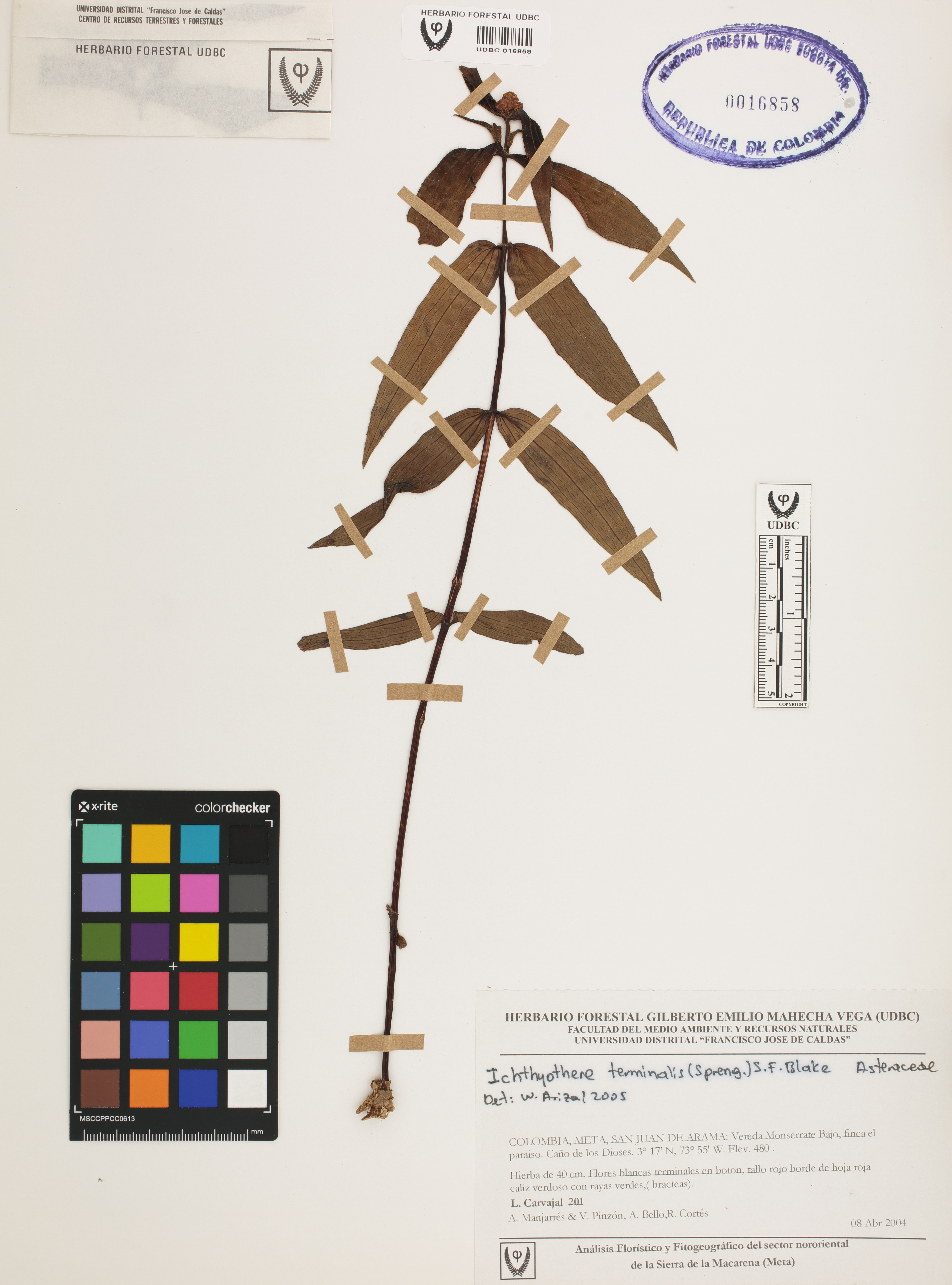 Fotografía del ejemplar Carvajal, L. 201, determinado como Ichthyothere terminalis en el año 2005