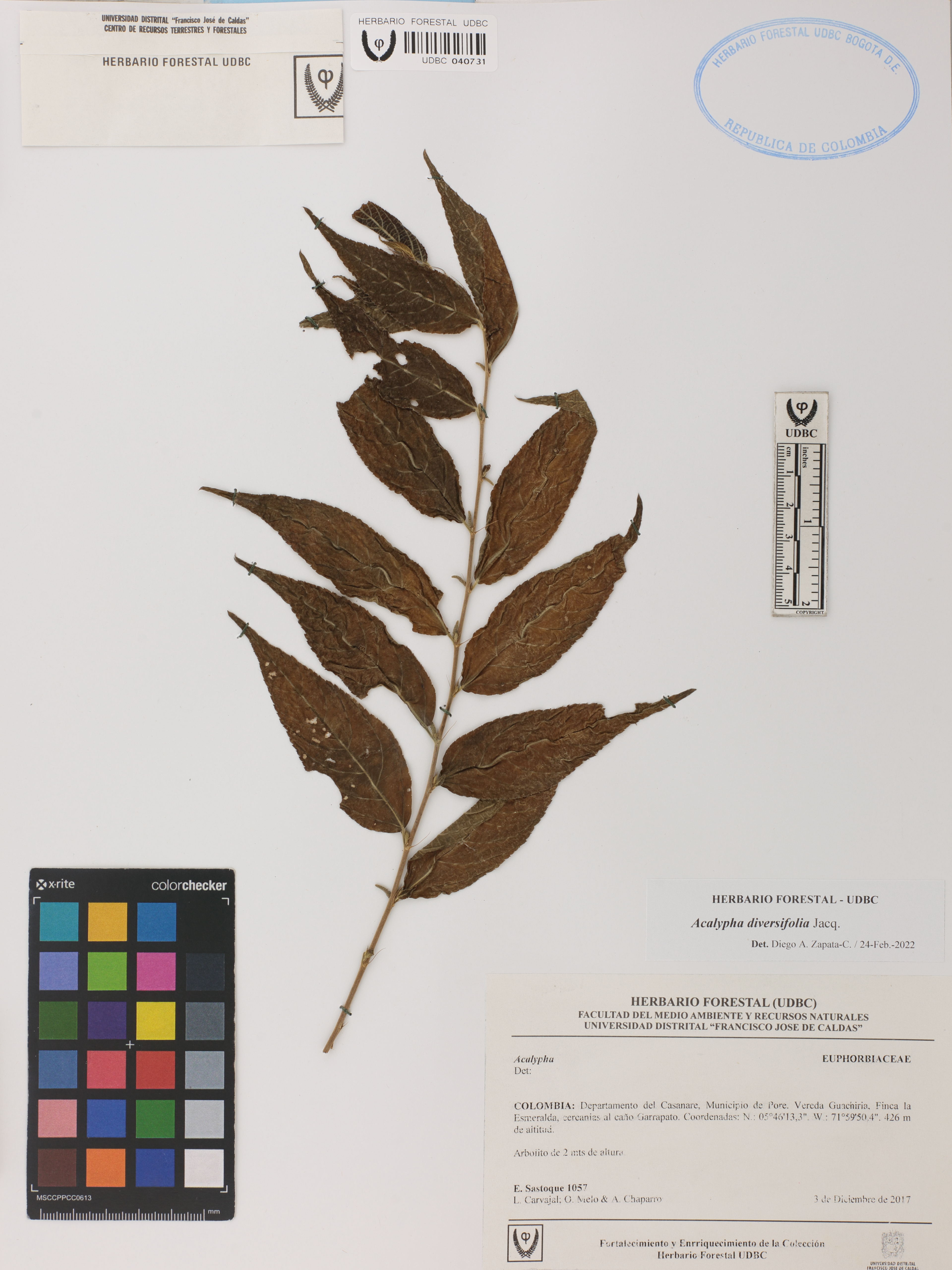 | dc.description | Fotografía del ejemplar Sastoque, E. 1057, determinado como Acalypha diversifolia en el año 2022 | |