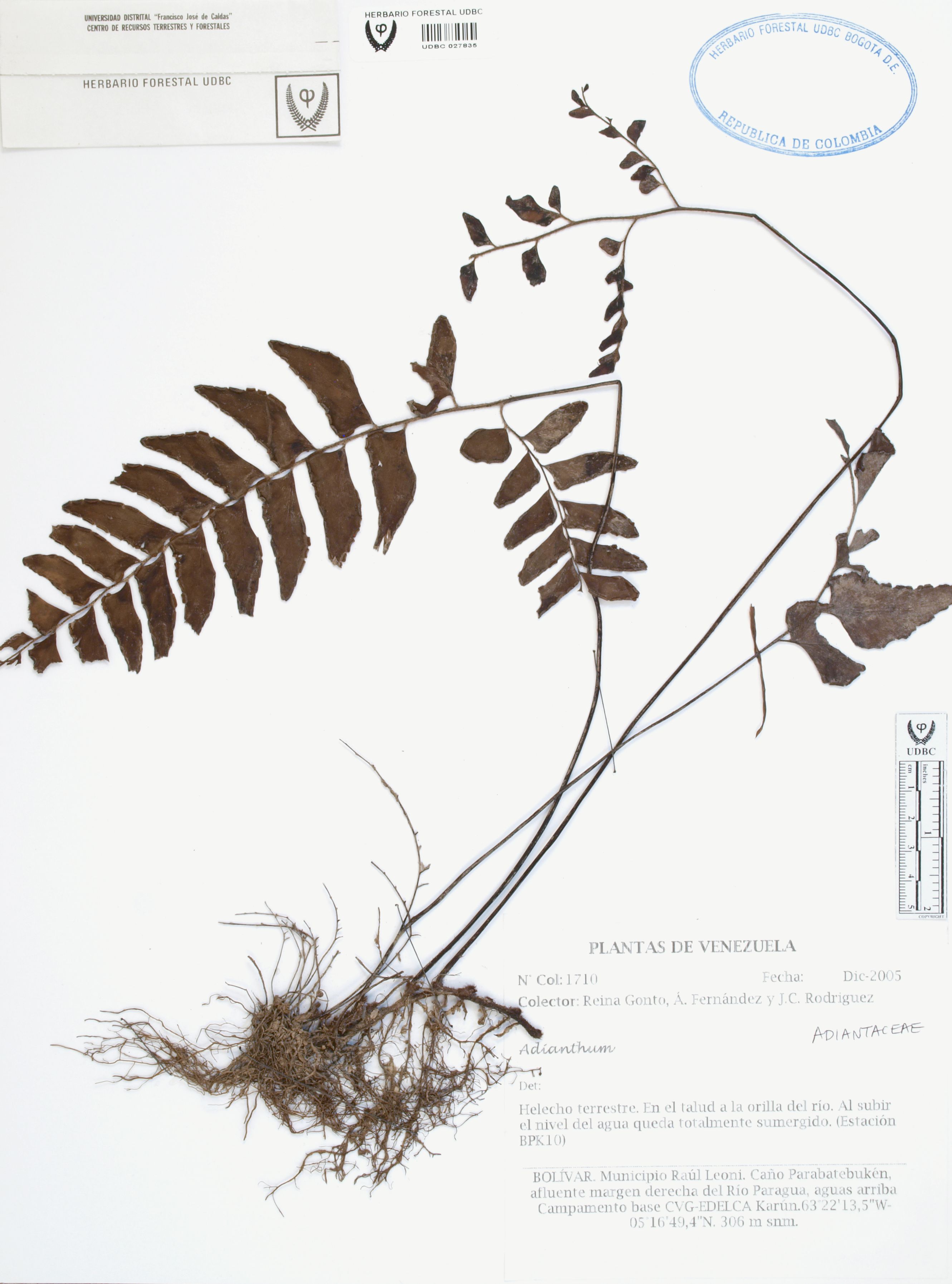 Fotografía del ejemplar Gonto, R. 1710, determinado como Adiantum sp.