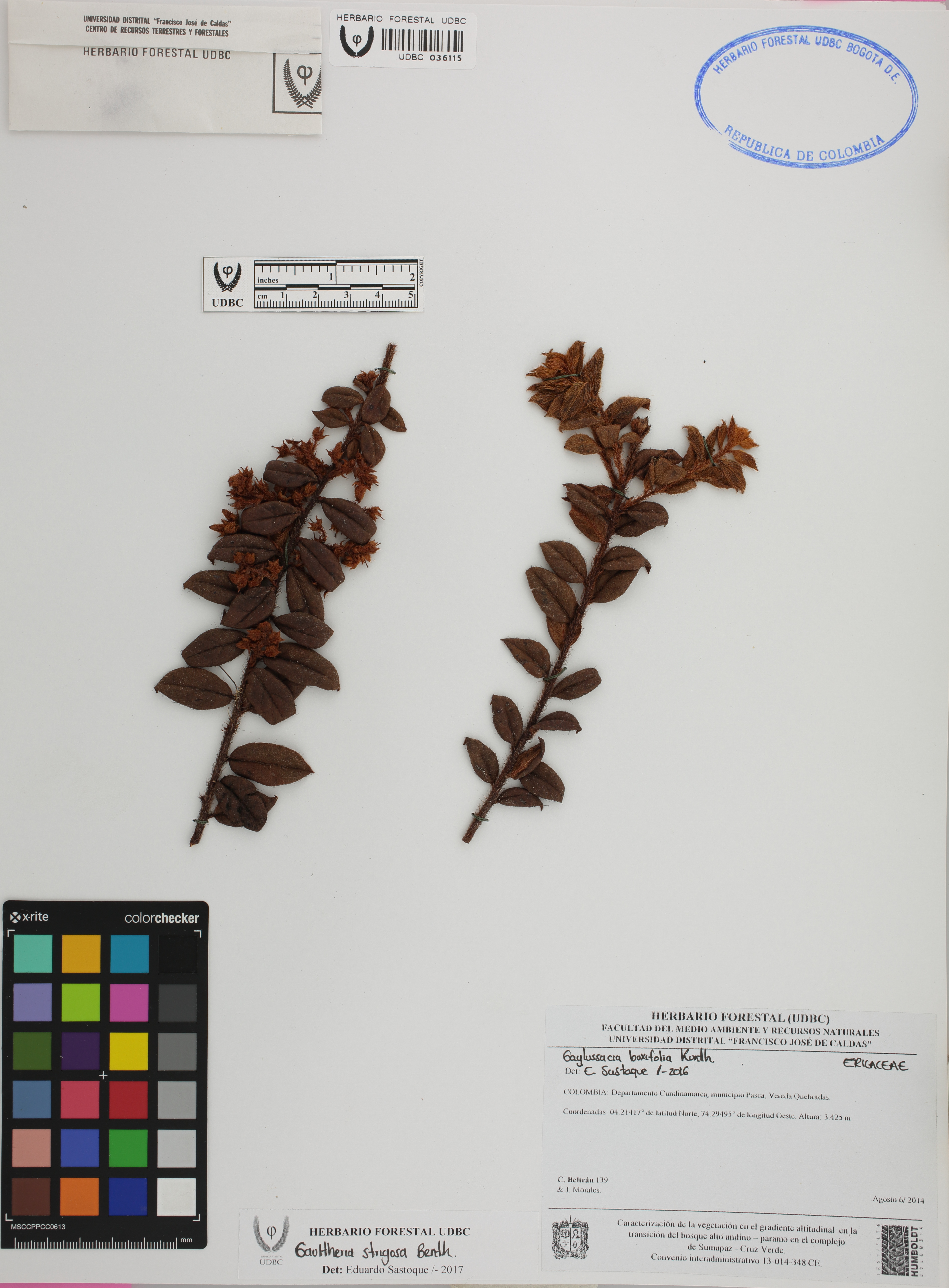 Fotografía del ejemplar Beltrán, C. 139, determinado como Gaultheria strigosa en el año 2017