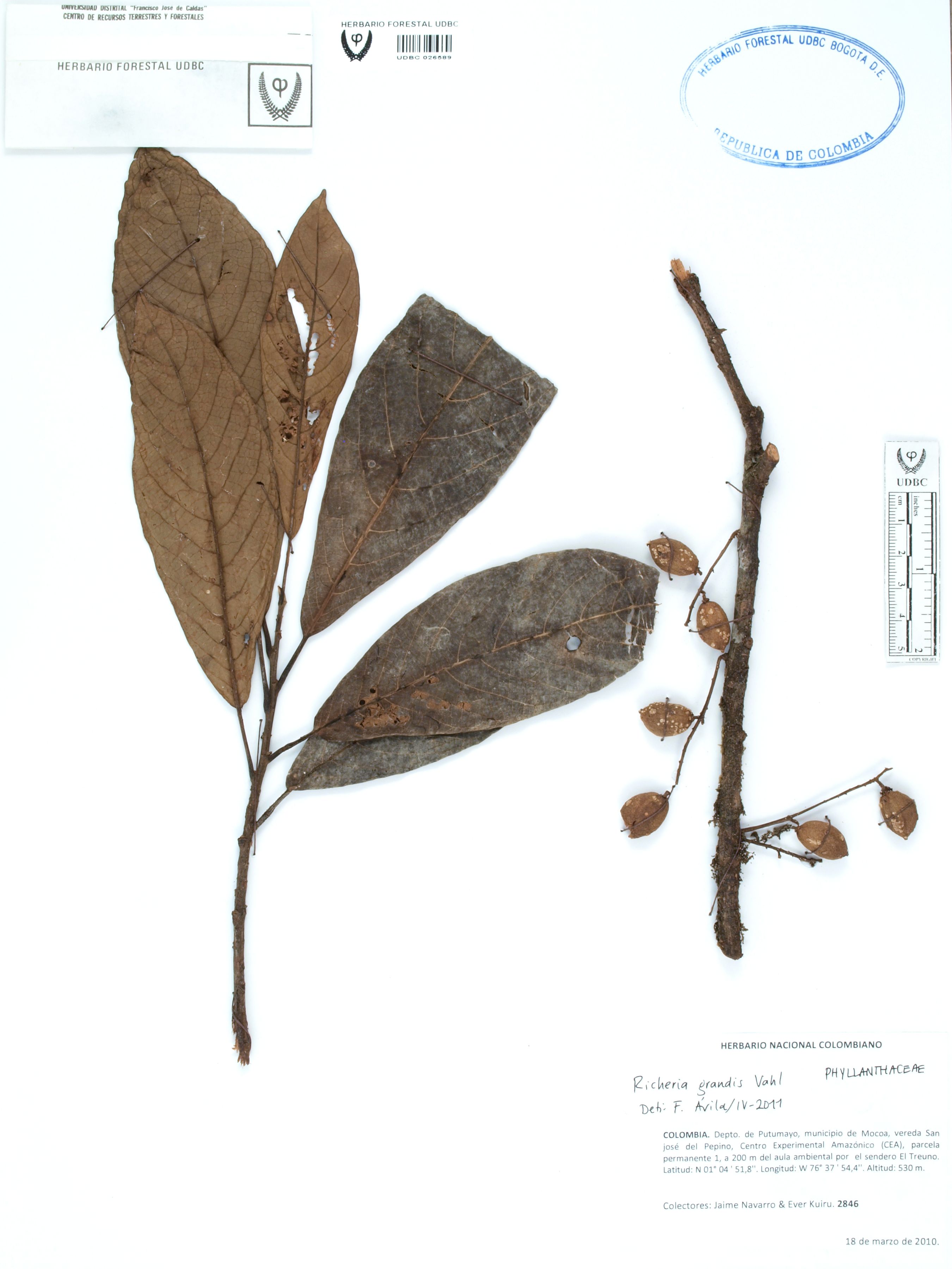 Fotografía del ejemplar Navarro, J. 2846, determinado como Richeria grandis en el año 2011