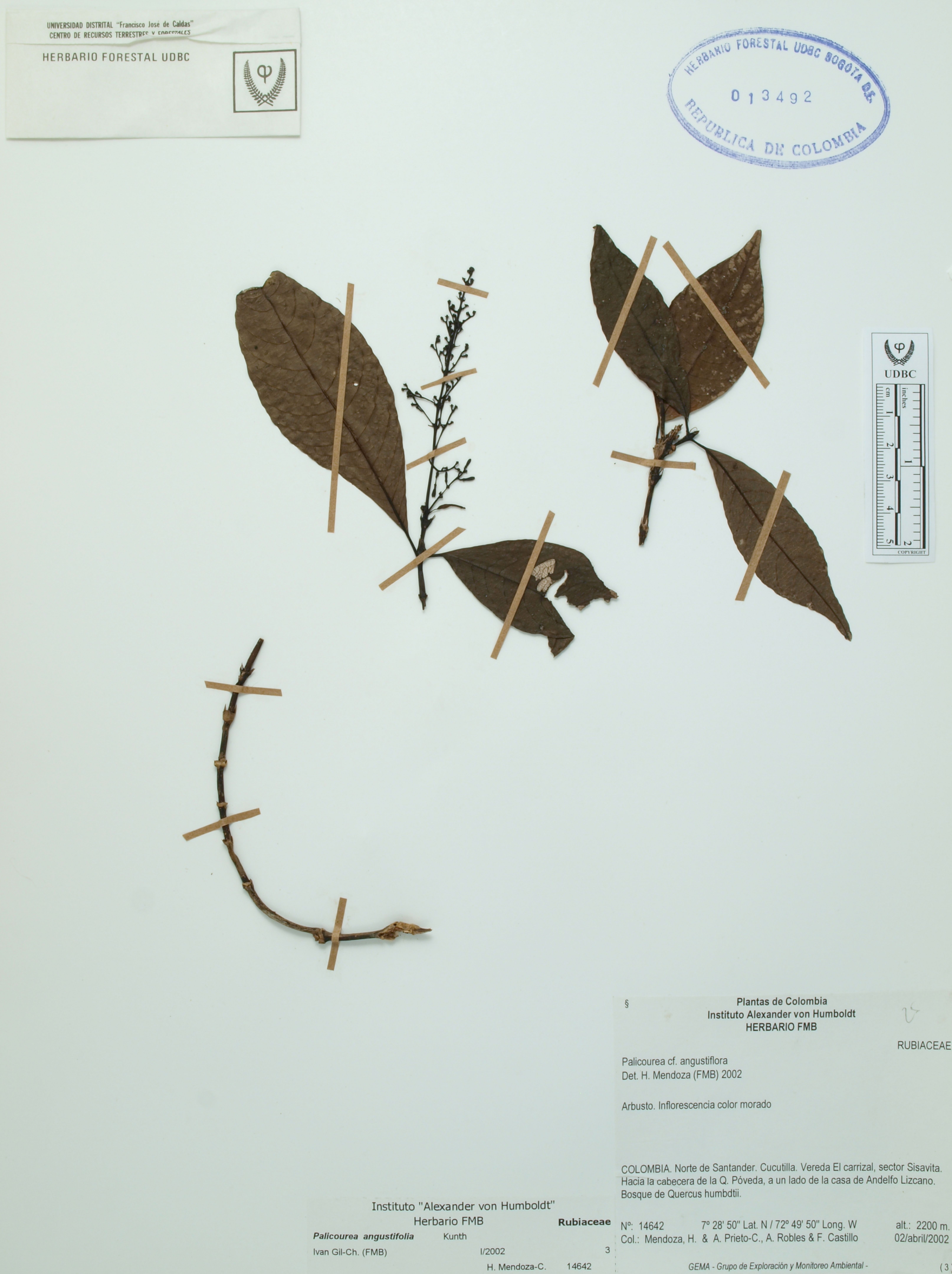 Fotografía del ejemplar Mendoza, H. 14642, determinado como Palicourea angustifolia en el año 2002