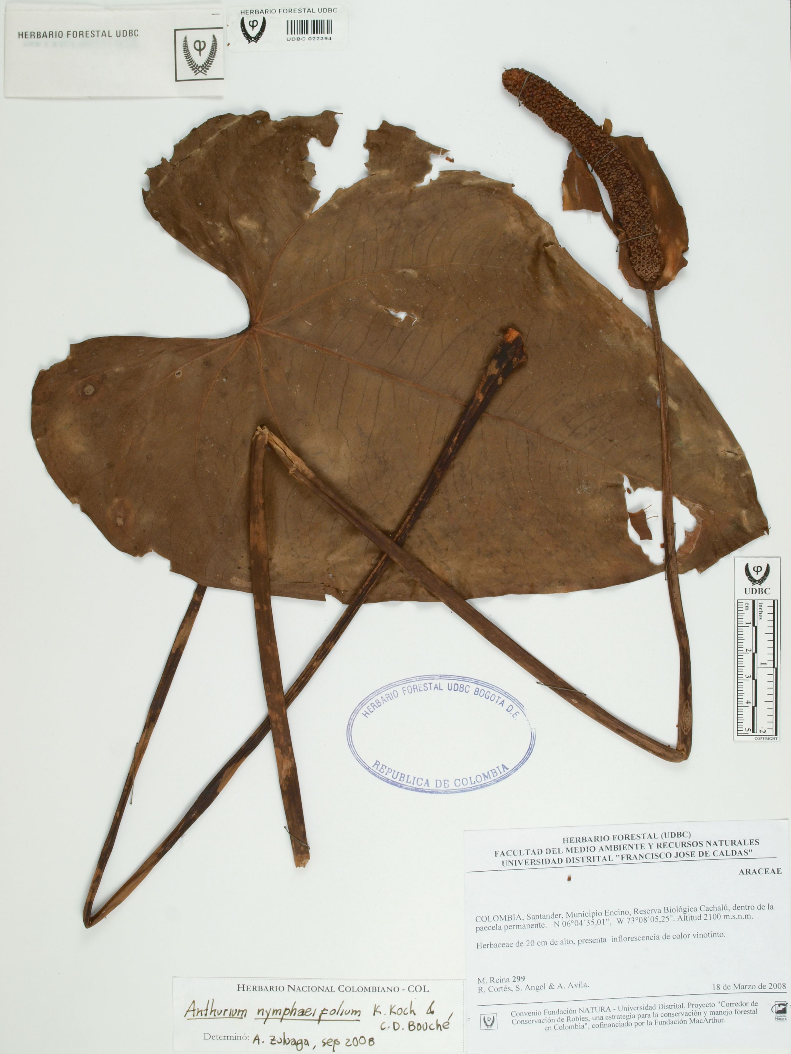 Fotografía del ejemplar Reina, M. 299, determinado como Anthurium nymphaeifolium en el año 2008