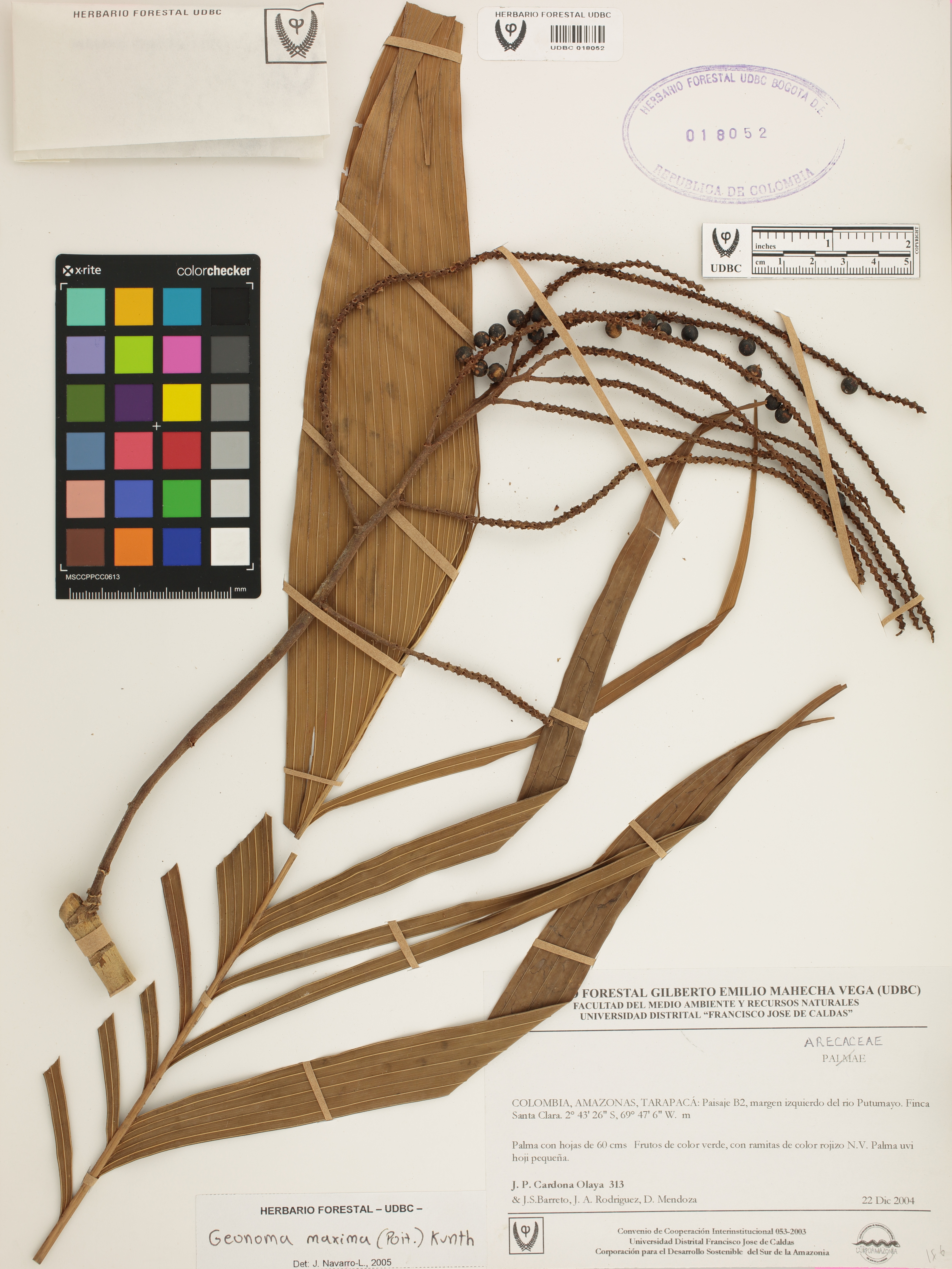 Fotografía del ejemplar Cardona, J. 313, determinado como Geonoma maxima en el año 2005