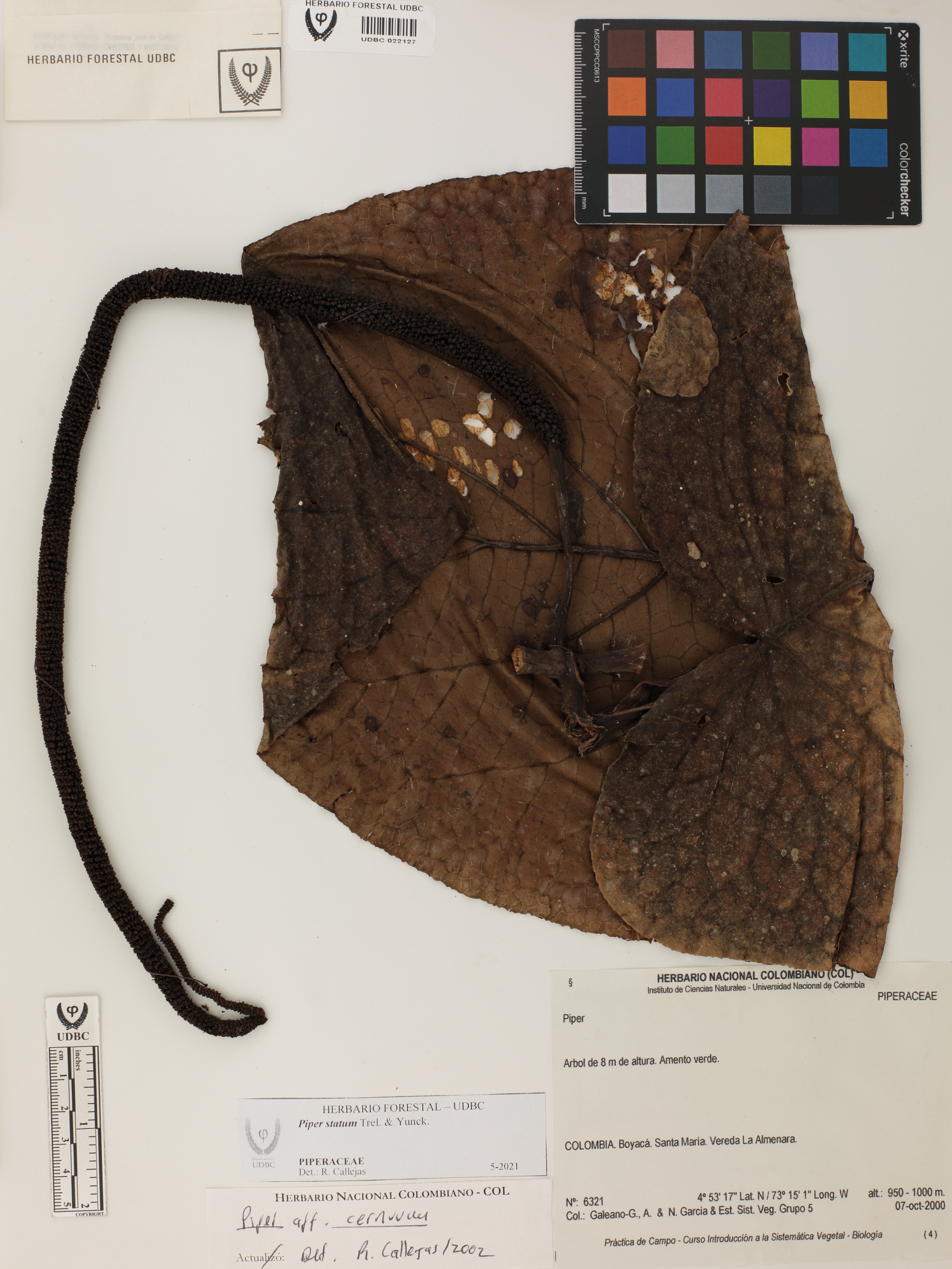 Fotografía del ejemplar Galeano, G. 6321, determinado como Piper statum en el año 2021