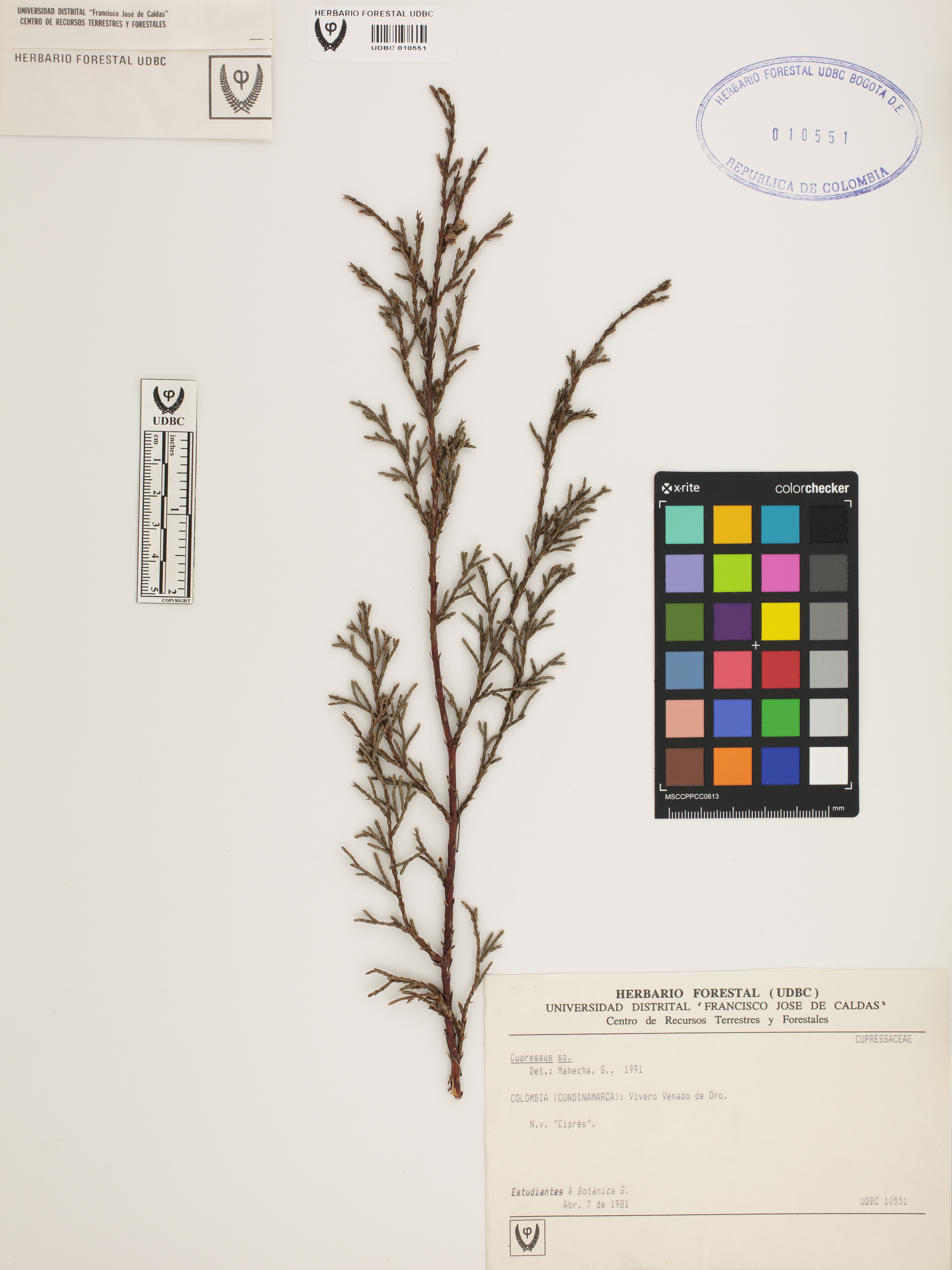 Fotografía del ejemplar Estudiantes Botánica G. 1981,, determinado como Cupressus sp. en el año 1991