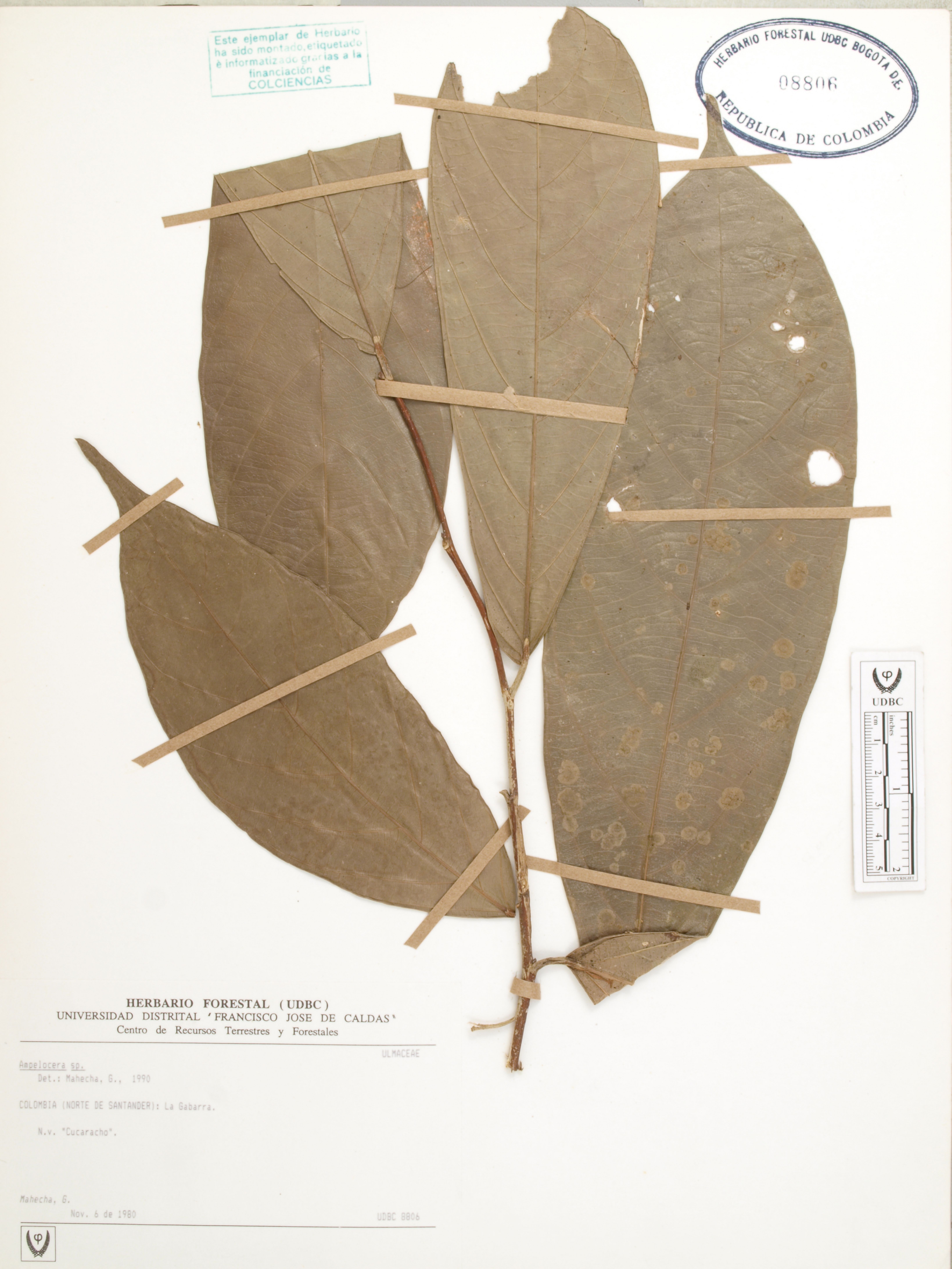 Fotografía del ejemplar Mahecha, G., determinado como Ampelocera sp. en el año 1990