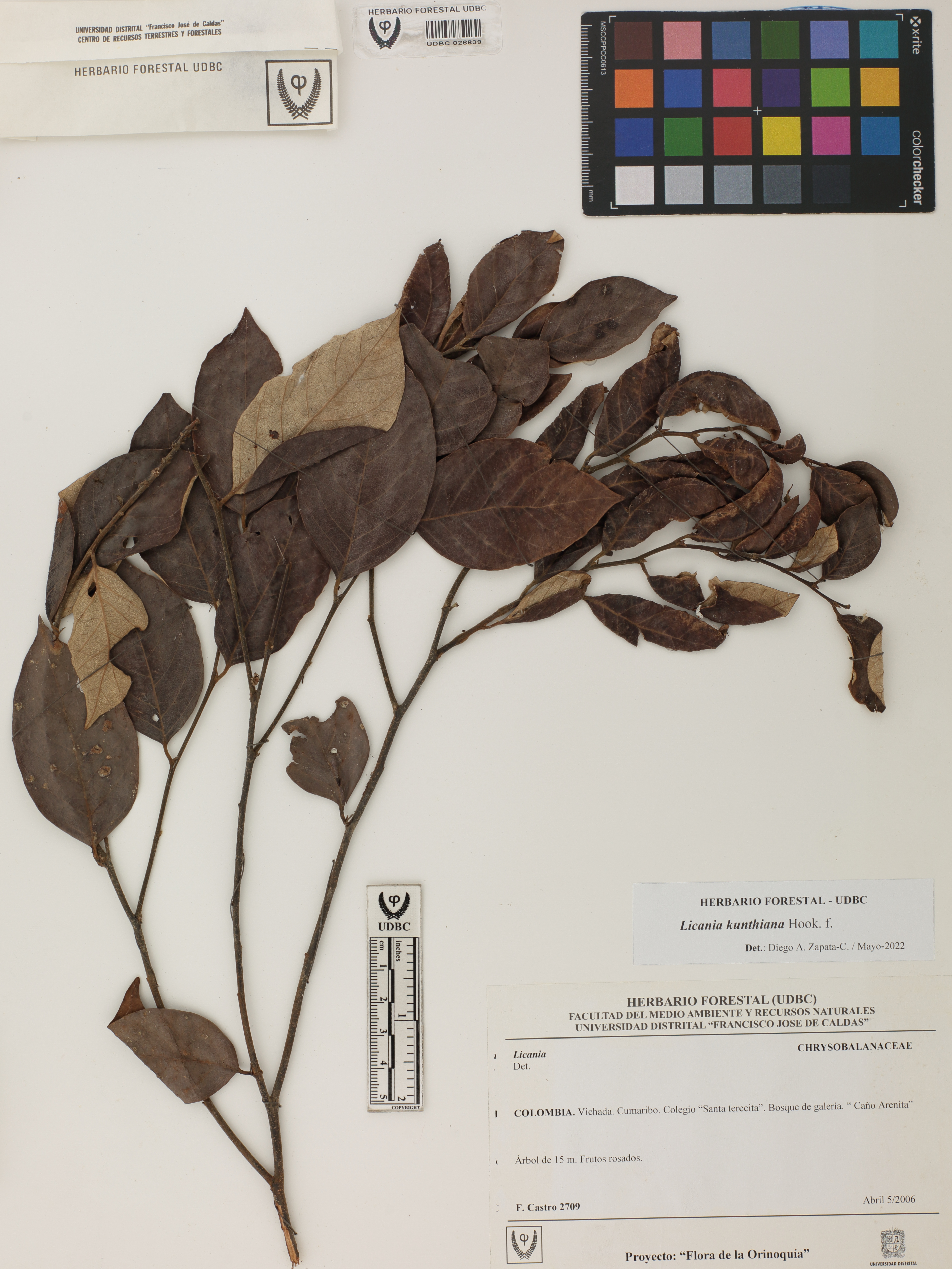 Fotografía del ejemplar Castro, F. 2709, determinado como Licania kunthiana en el año 2022
