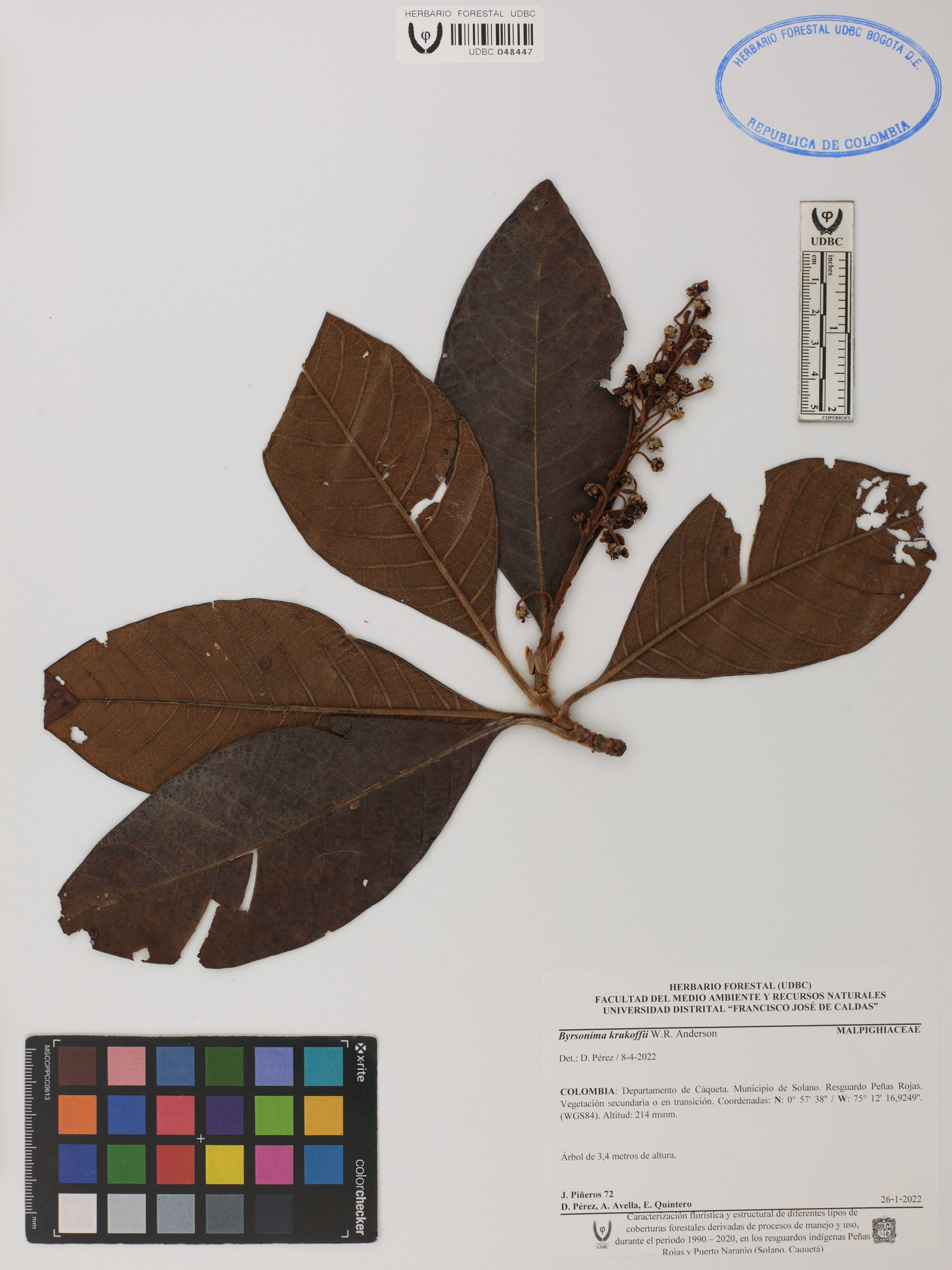| dc.description | Fotografía del ejemplar Piñeros, J. 72, determinado como Byrsonima krukoffii en el año 2022 | |