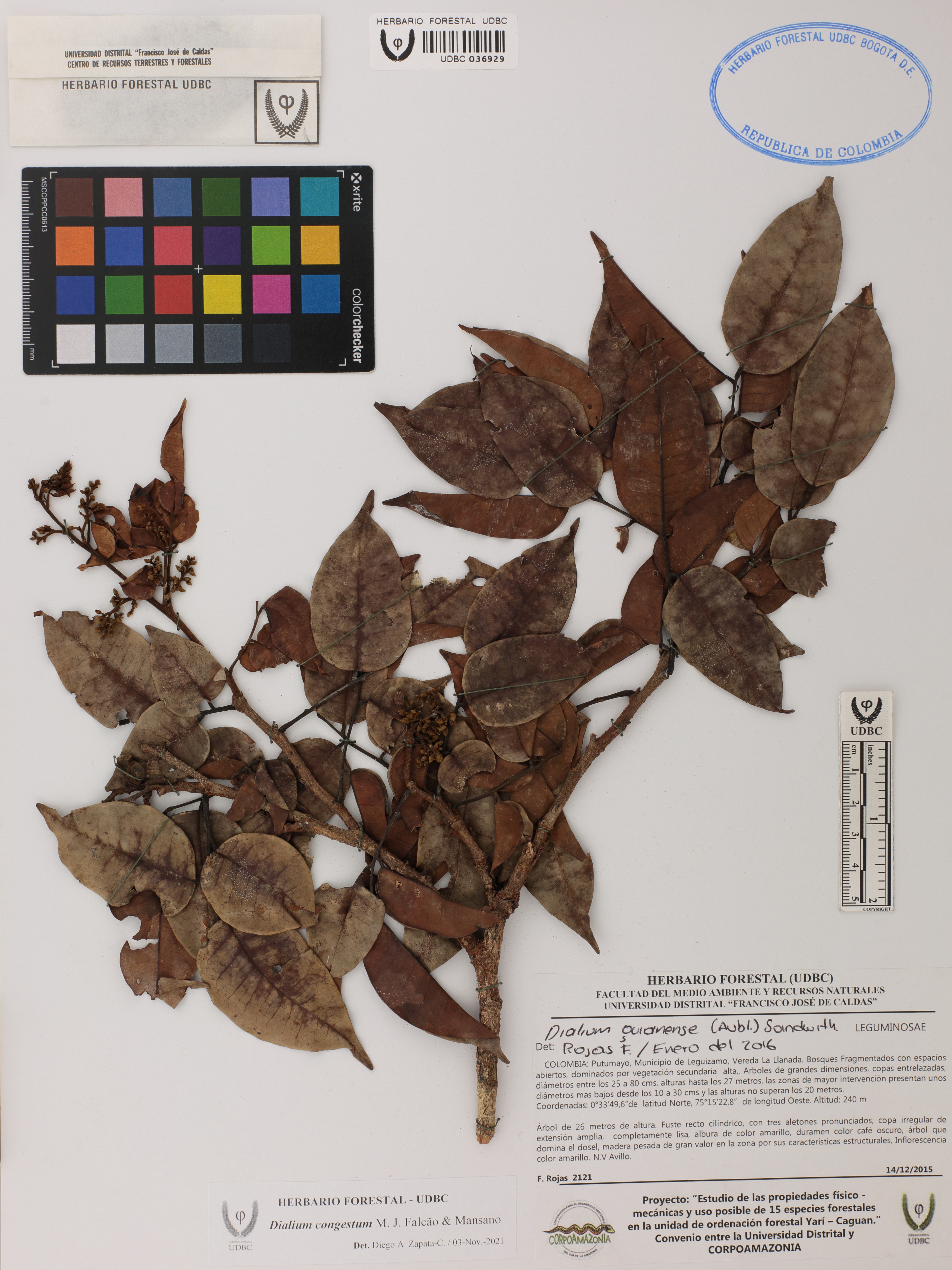 | dc.description | Fotografía del ejemplar Rojas, F. 2121, determinado como Dialium congestum en el año 2021 | |