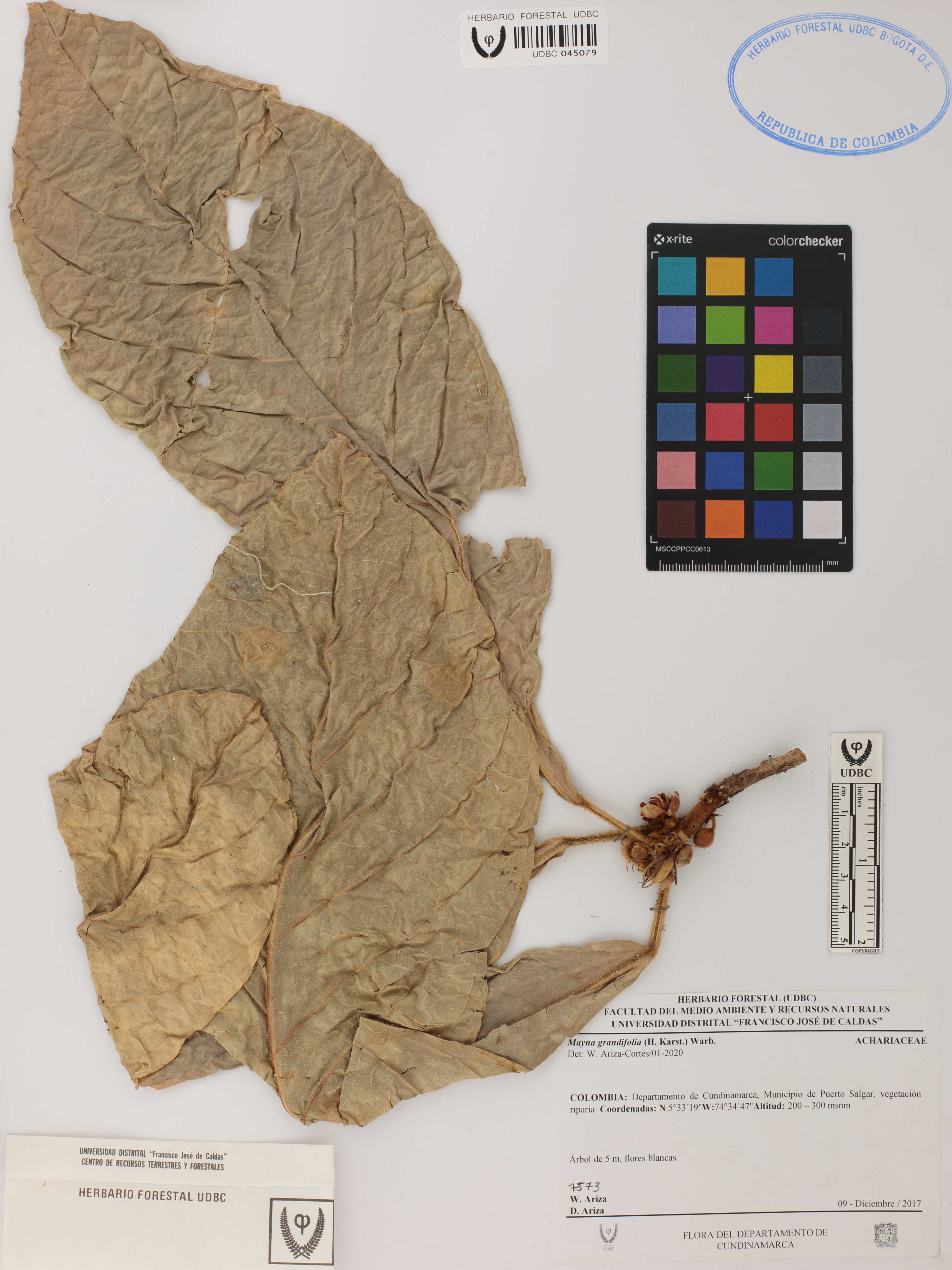 Fotografía del ejemplar Ariza-Cortés, W. 7573, determinado como Mayna grandifolia en el año 2020