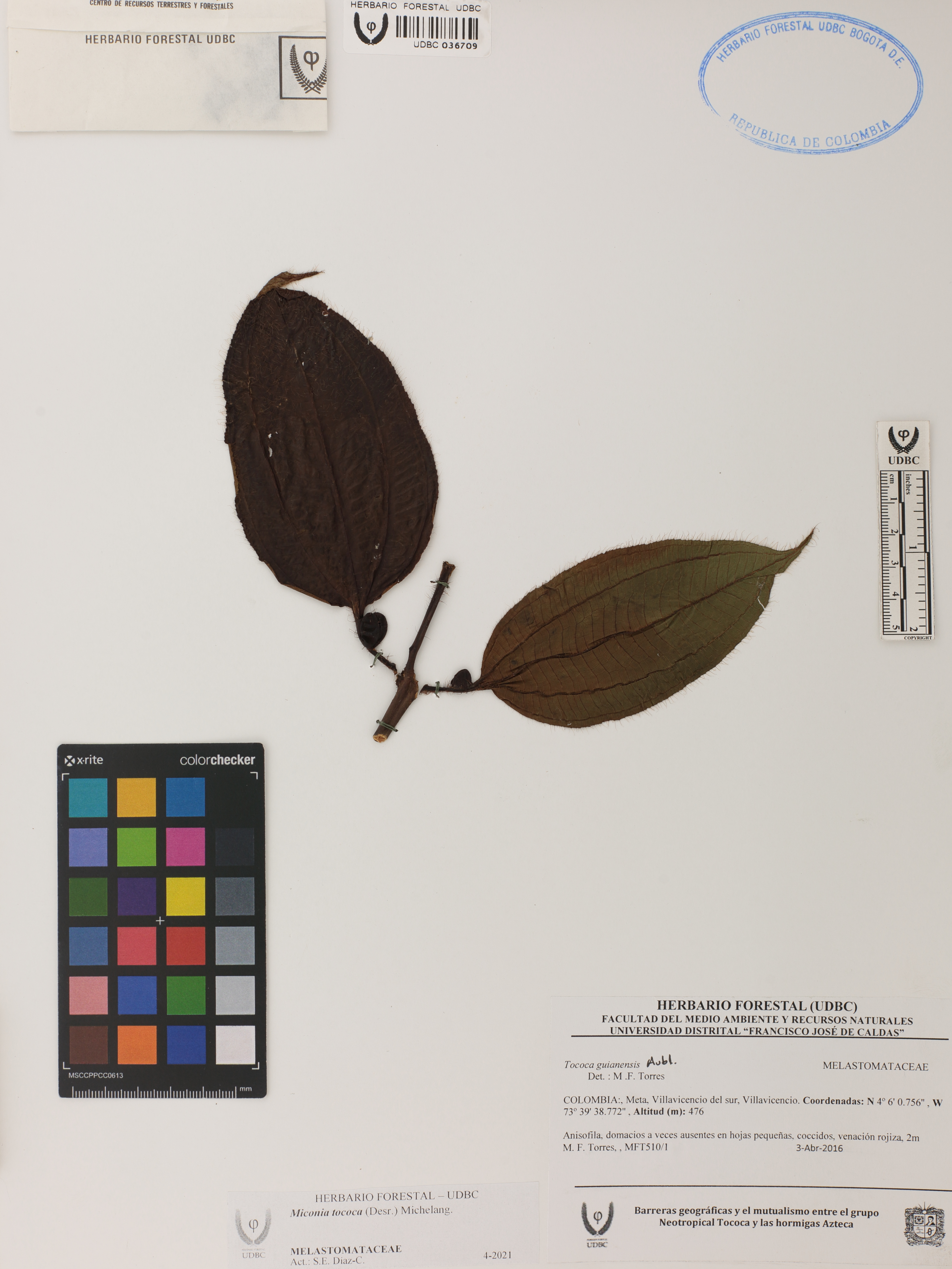 Fotografía del ejemplar Torres, M. 510/1, determinado como Miconia tococa en el año 2016