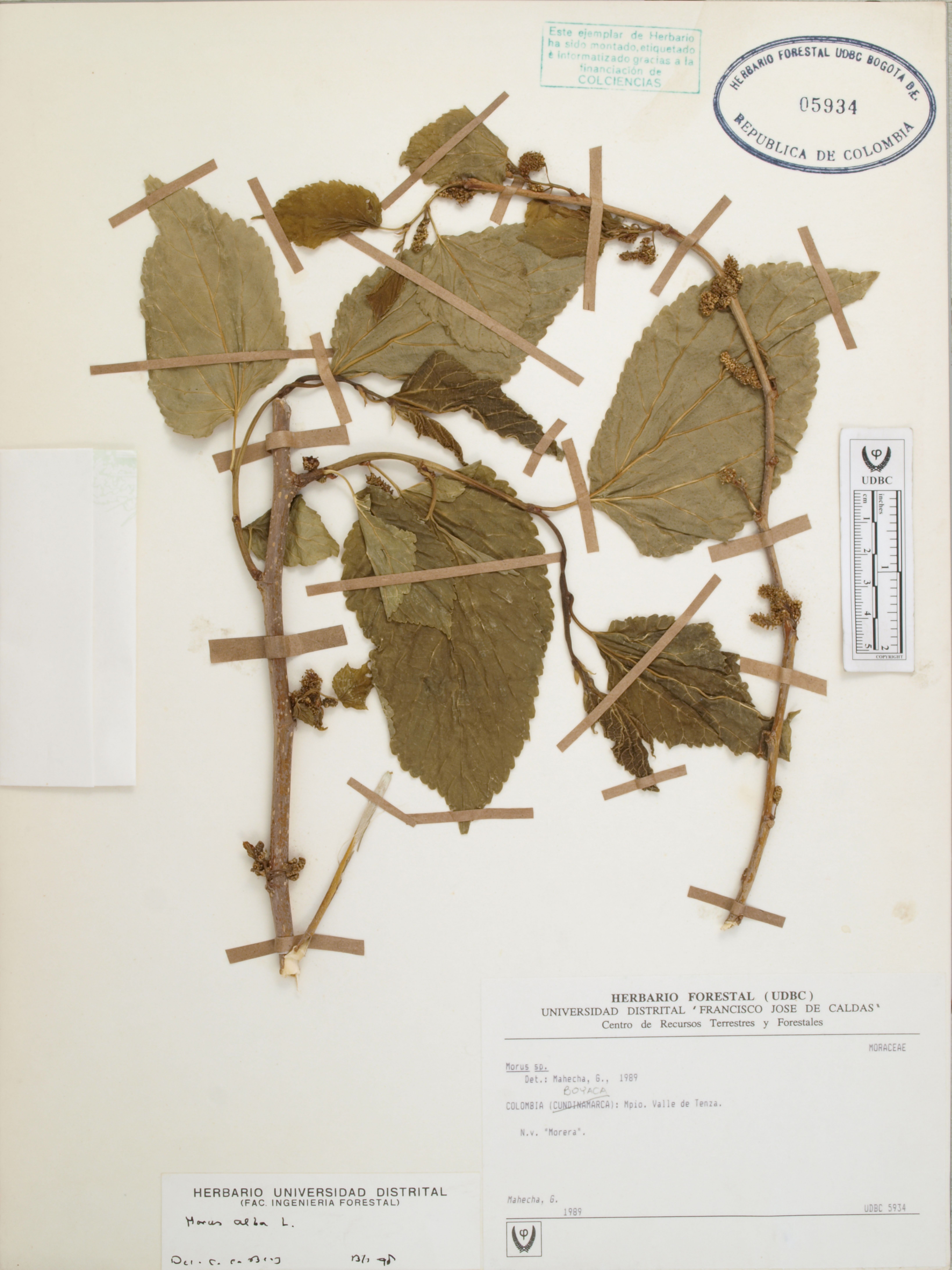 Fotografía del ejemplar Mahecha, G., determinado como Morus alba en el año 1997