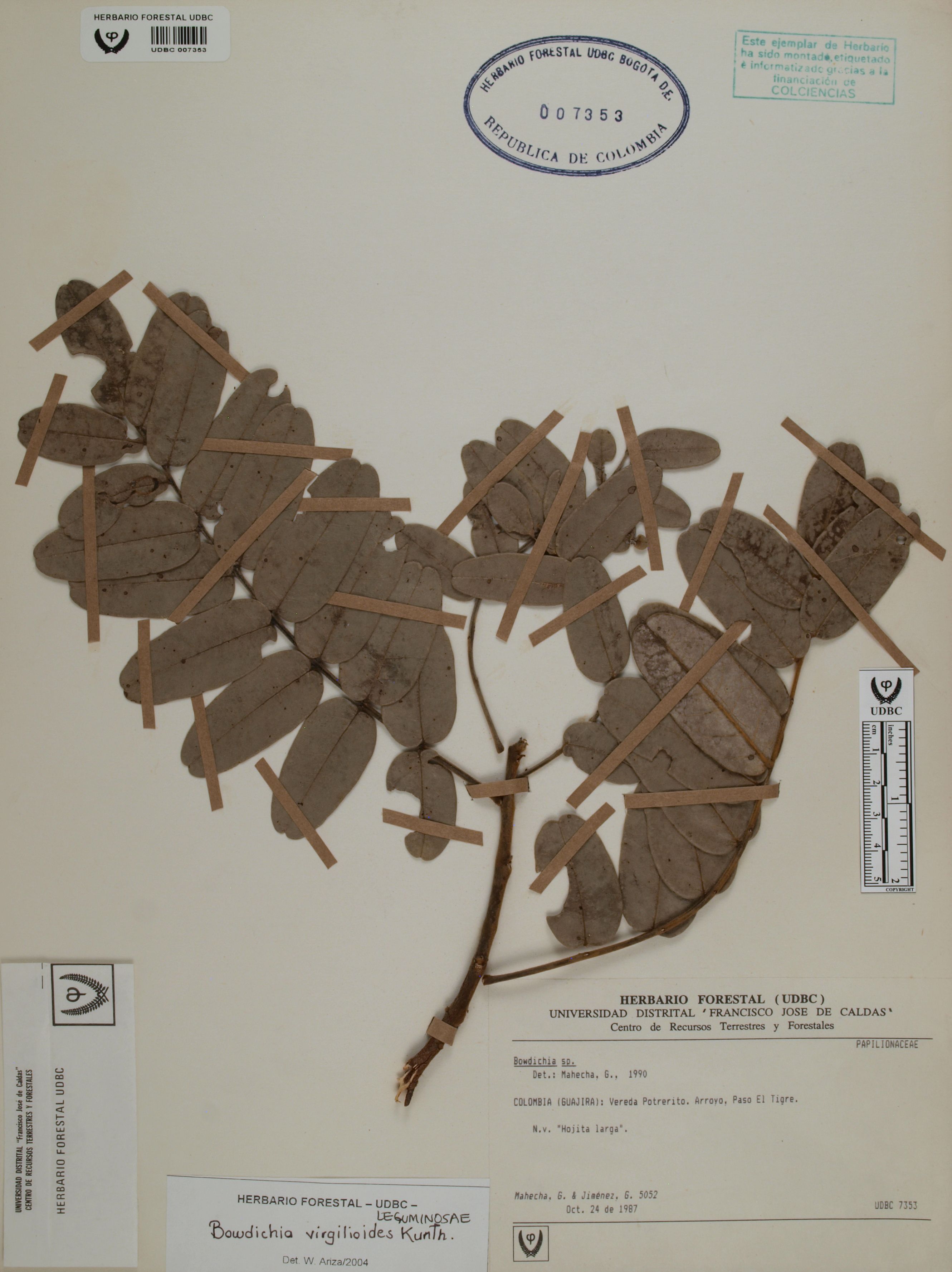 Fotografía del ejemplar Mahecha, G. 5052, determinado como Bowdichia virgilioides en el año 2004
