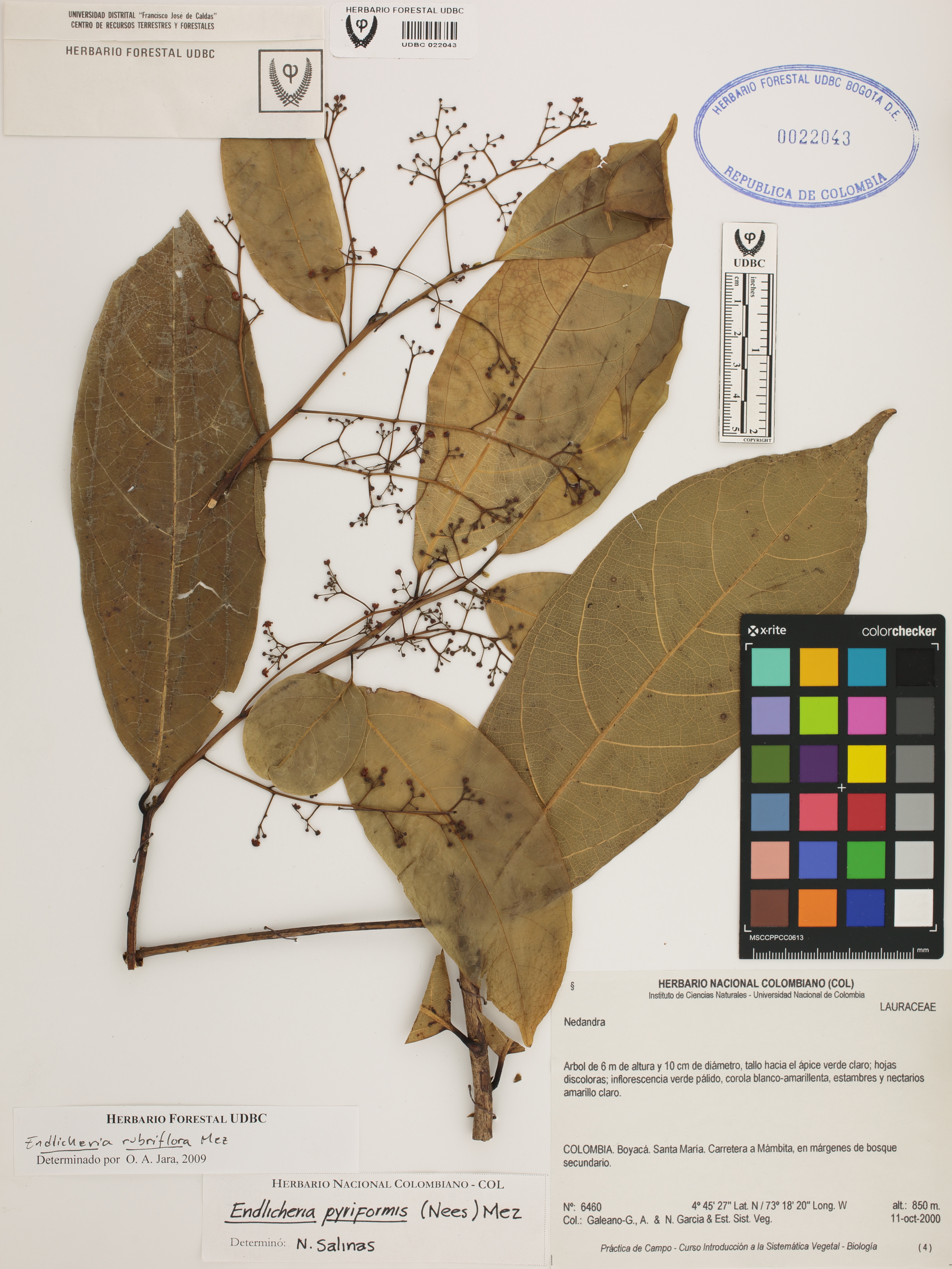 Fotografía del ejemplar Galeano-G., A. 6460, determinado como Endlicheria rubriflora en el año 2009