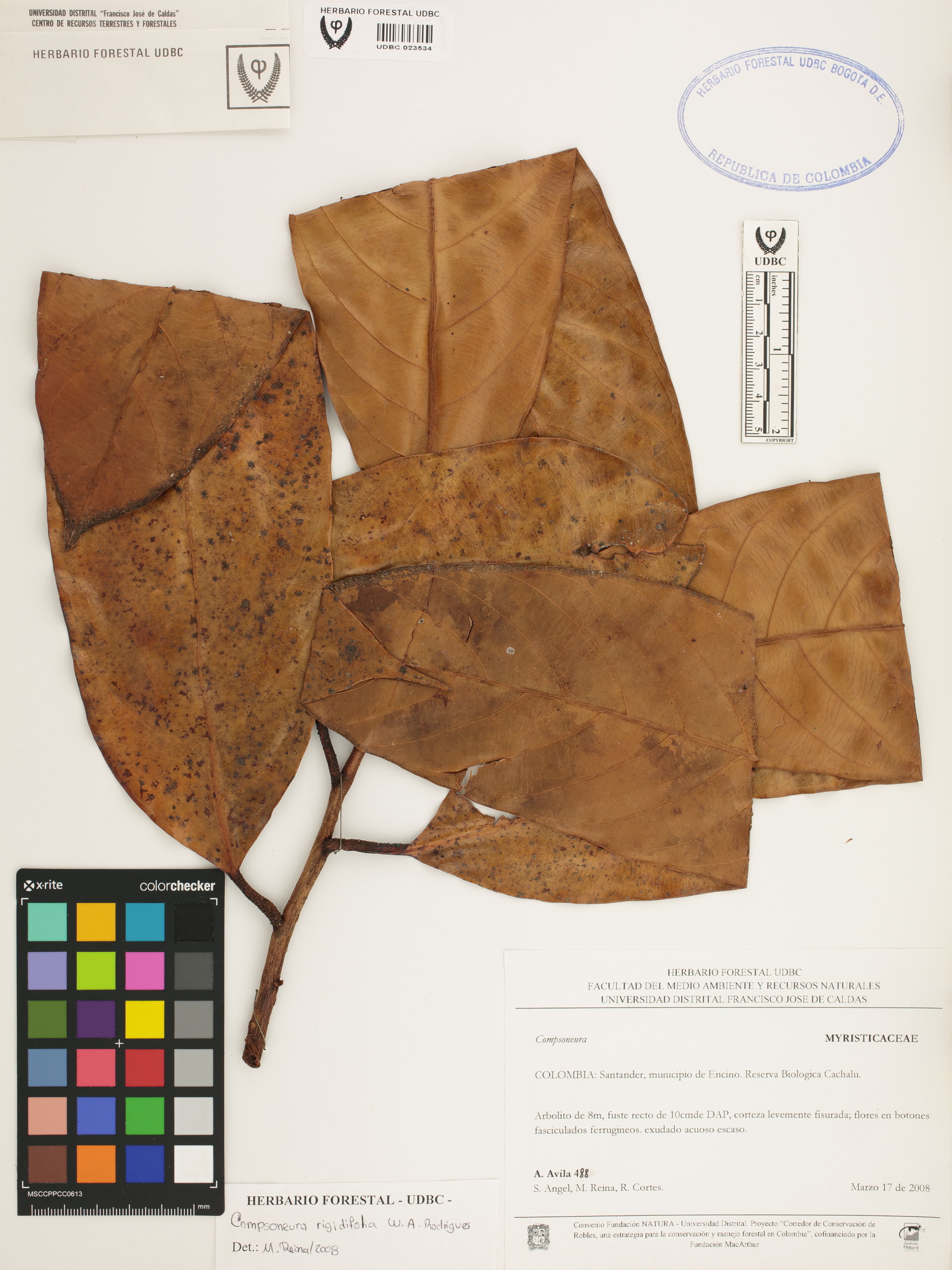 Fotografía del ejemplar Ávila, A. 488, determinado como Compsoneura rigidifolia en el año 2008
