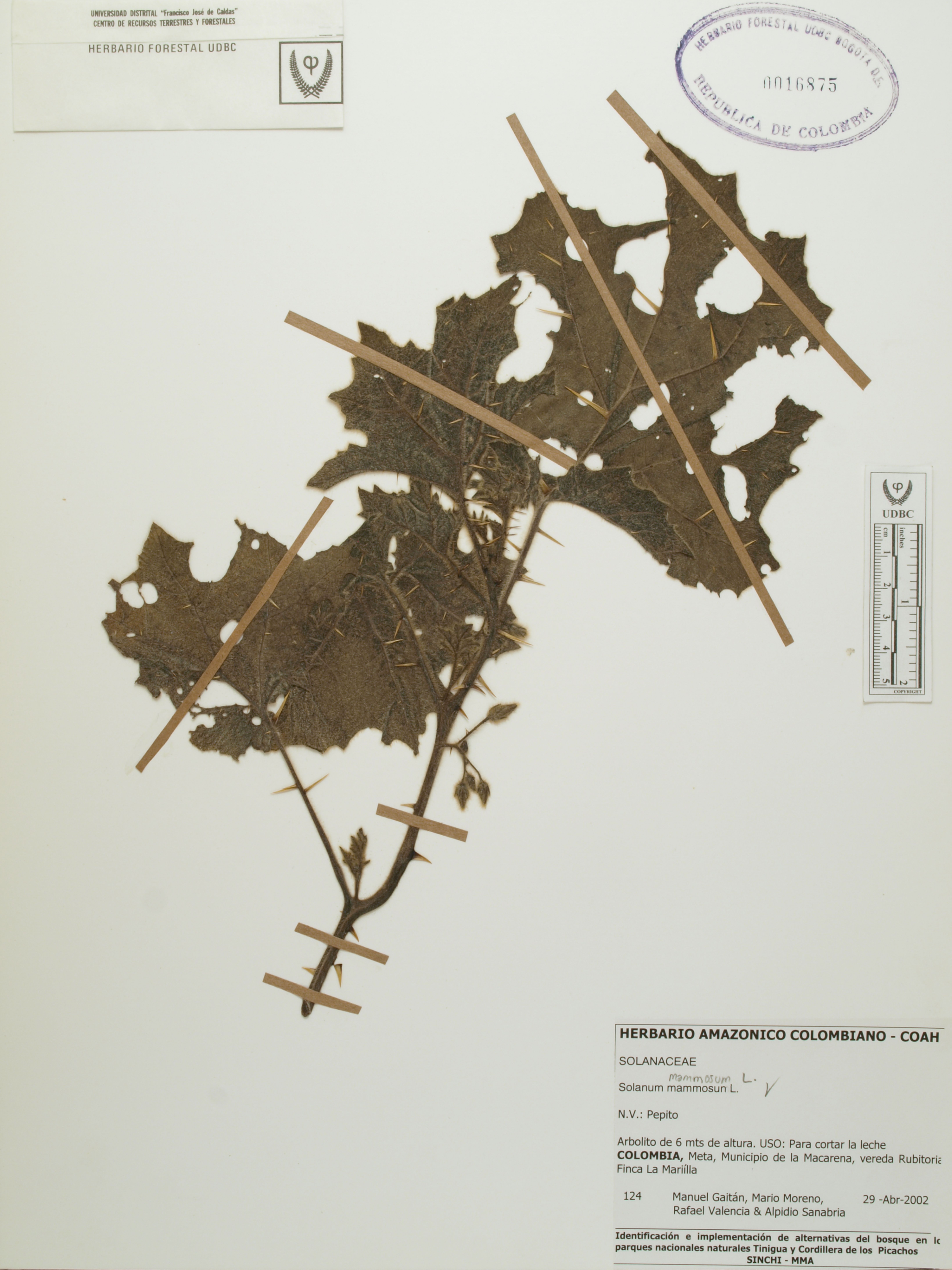 Fotografía del ejemplar Gaitán, M. 124, determinado como Solanum mammosum