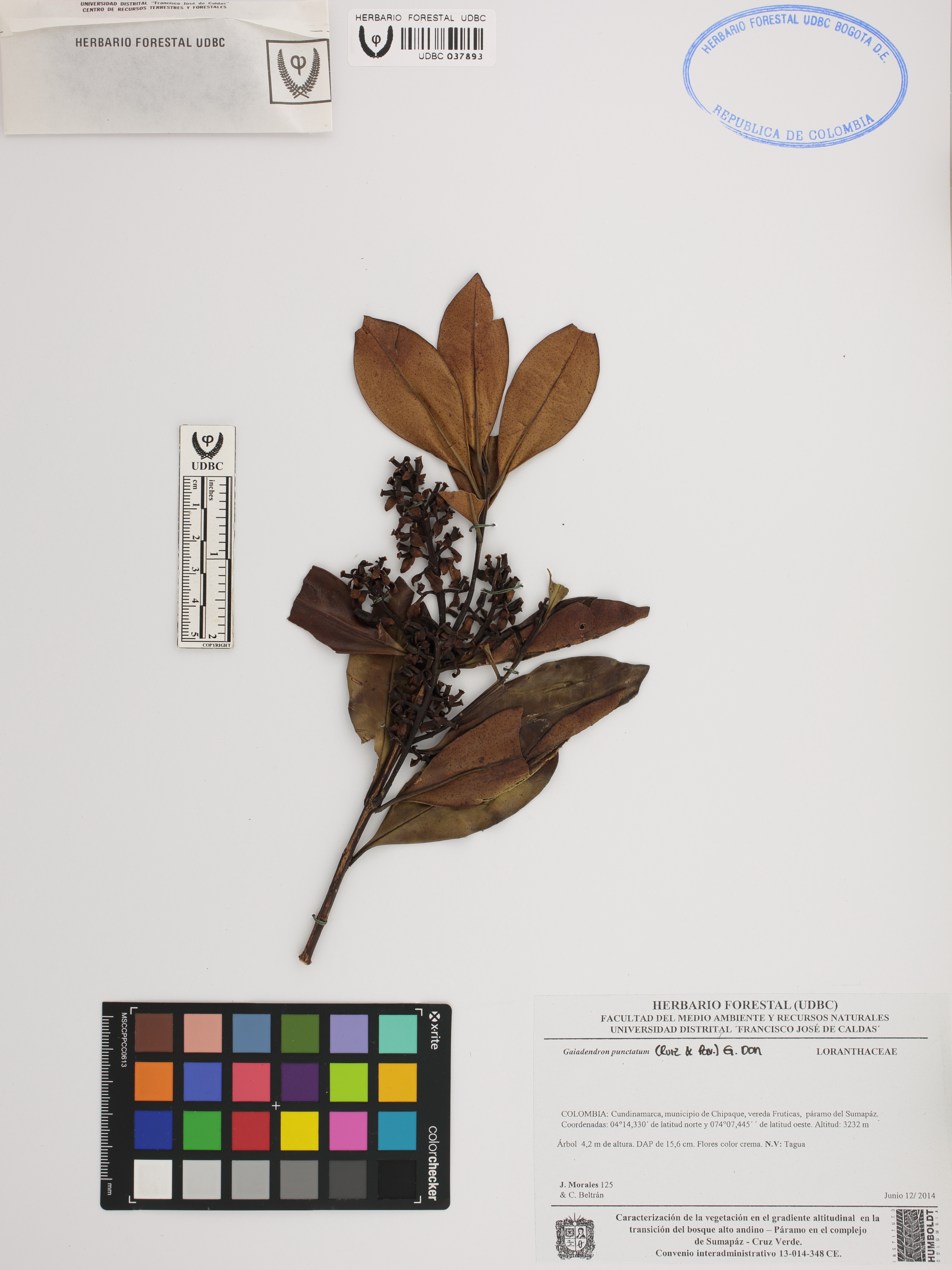 Fotografía del ejemplar Morales, J. 125, determinado como Gaiadendron punctatum