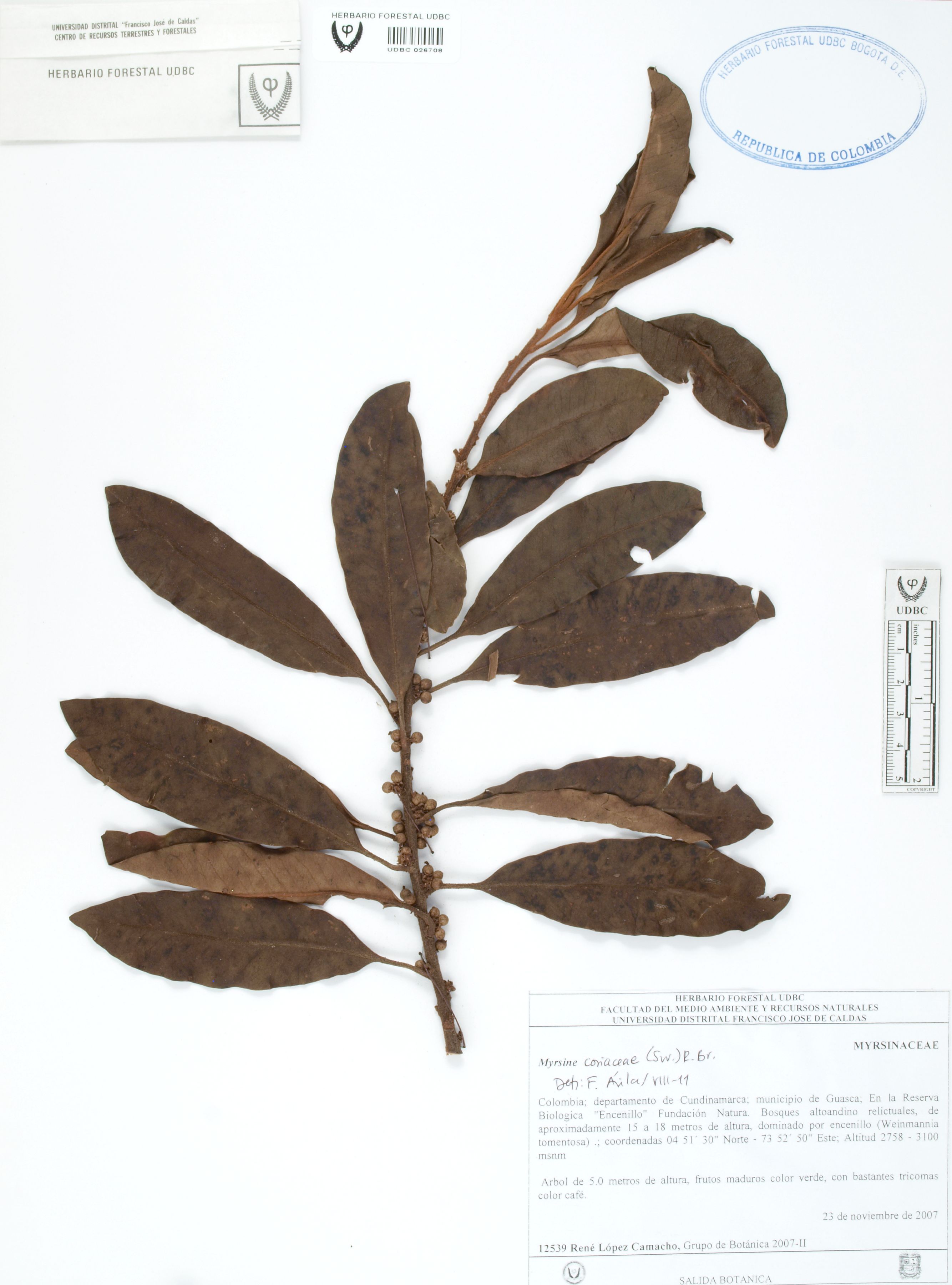 Fotografía del ejemplar López, R. 12539, determinado como Myrsine coriacea en el año 2011