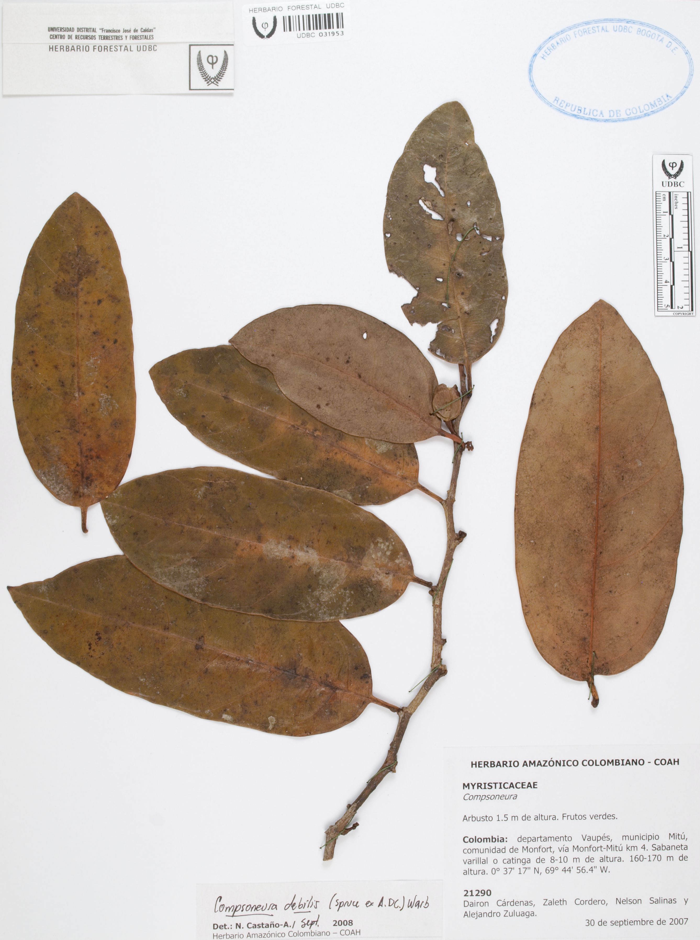 Fotografía del ejemplar Cárdenas, D. 21290, determinado como Compsoneura debilis en el año 2008