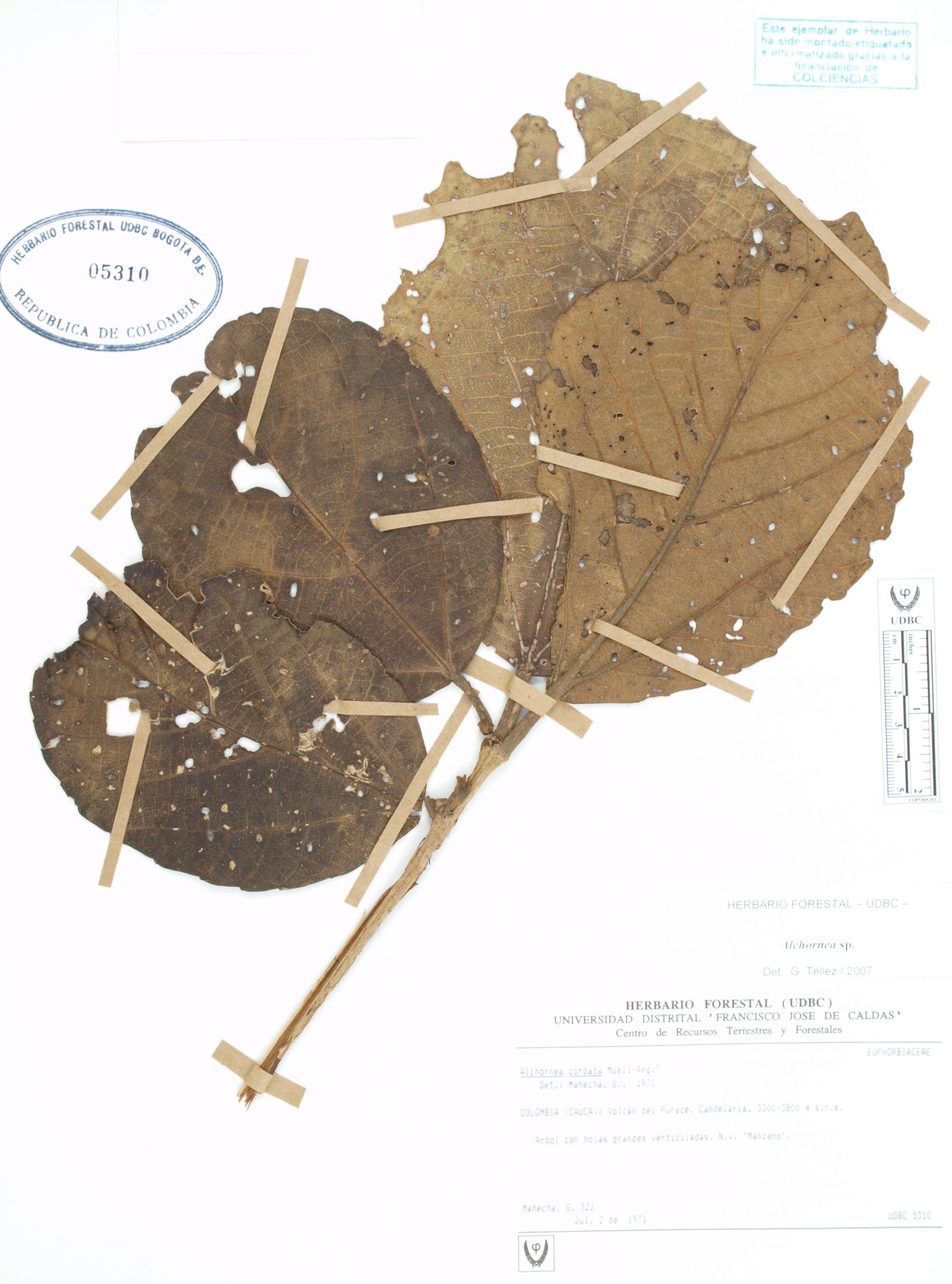Fotografía del ejemplar Mahecha, G. 521, determinado como Alchornea sp. en el año 2007