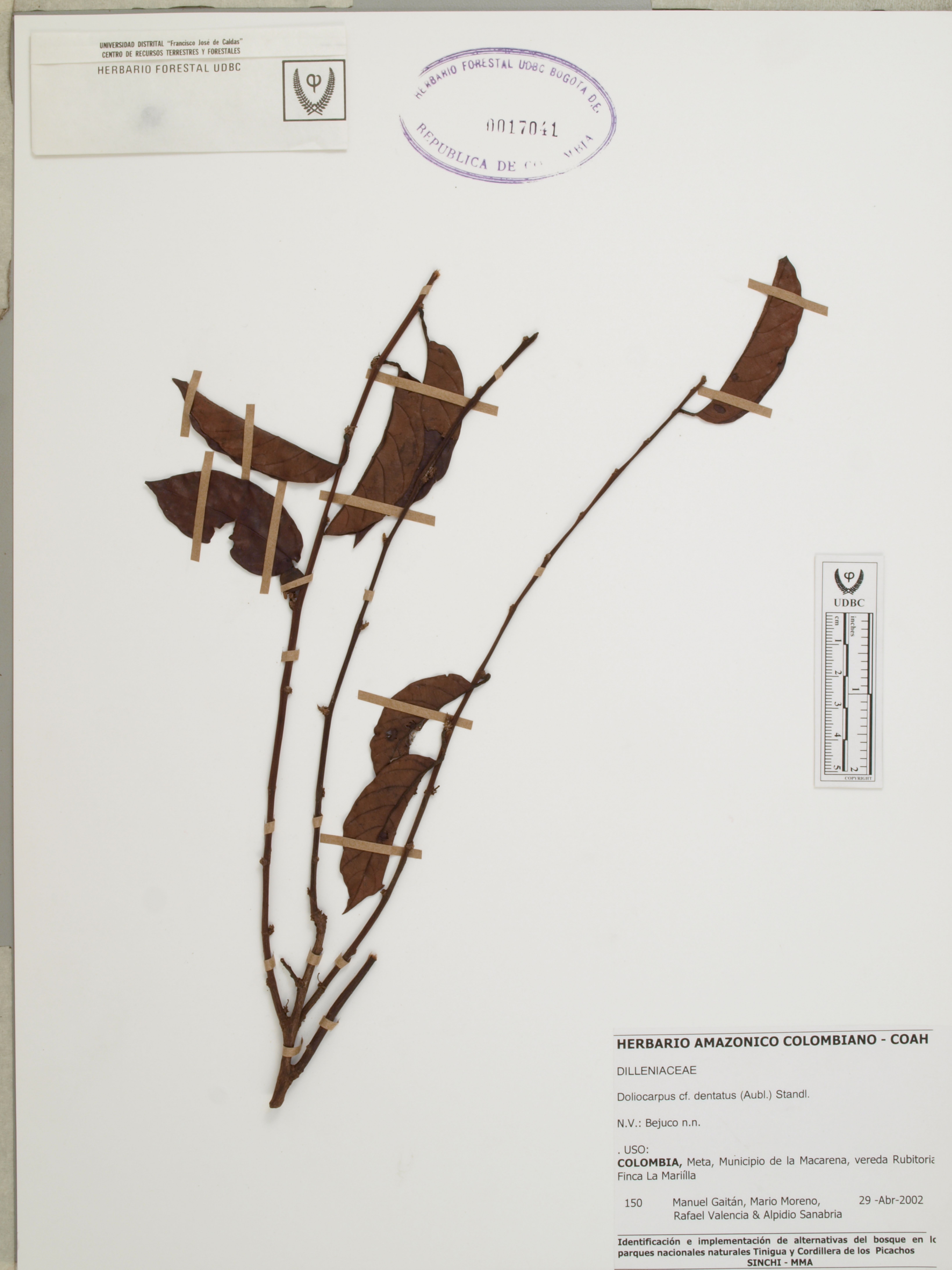 Fotografía del ejemplar Gaitán, M. 150, determinado como Doliocarpus dentatus