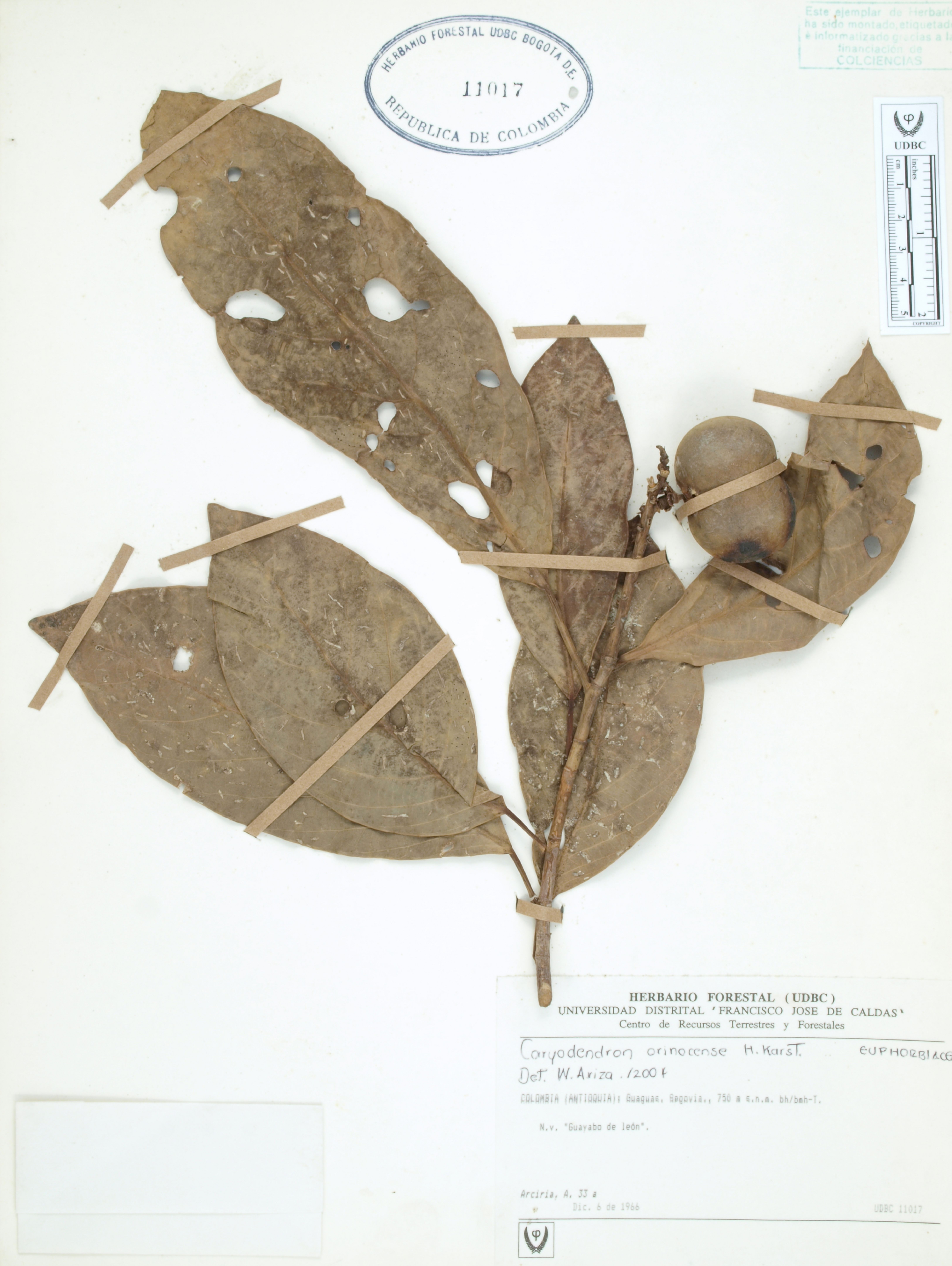 | dc.description | Fotografía del ejemplar Arciria, A. 33, determinado como Caryodendron orinocense en el año 2004 | |